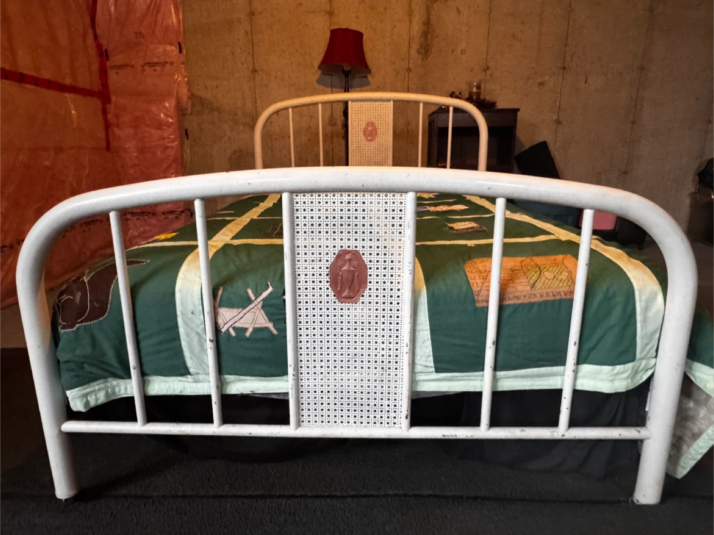 Selling a vintage white metal bed frame. It features a unique decorative centre. Perfect for adding a touch of retro charm to your bedroom!