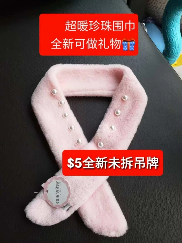 A super warm, brand new pink scarf with pearl embellishments! It's still got its tag on and would make a lovely gift