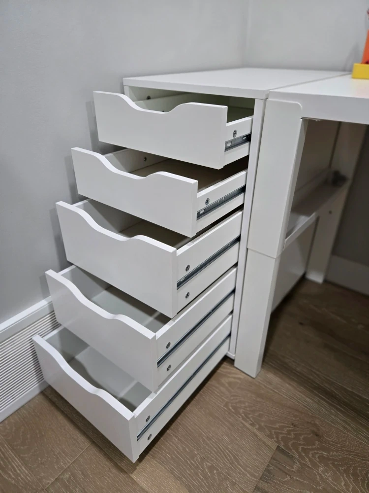 Selling an IKEA desk with an Alex drawer unit! It's in great condition and perfect for a home office or student space. The desk is white and features adjustable legs for customized height. The Alex drawer unit provides ample storage with its five drawers. There are some minor scratches on the desk surface.