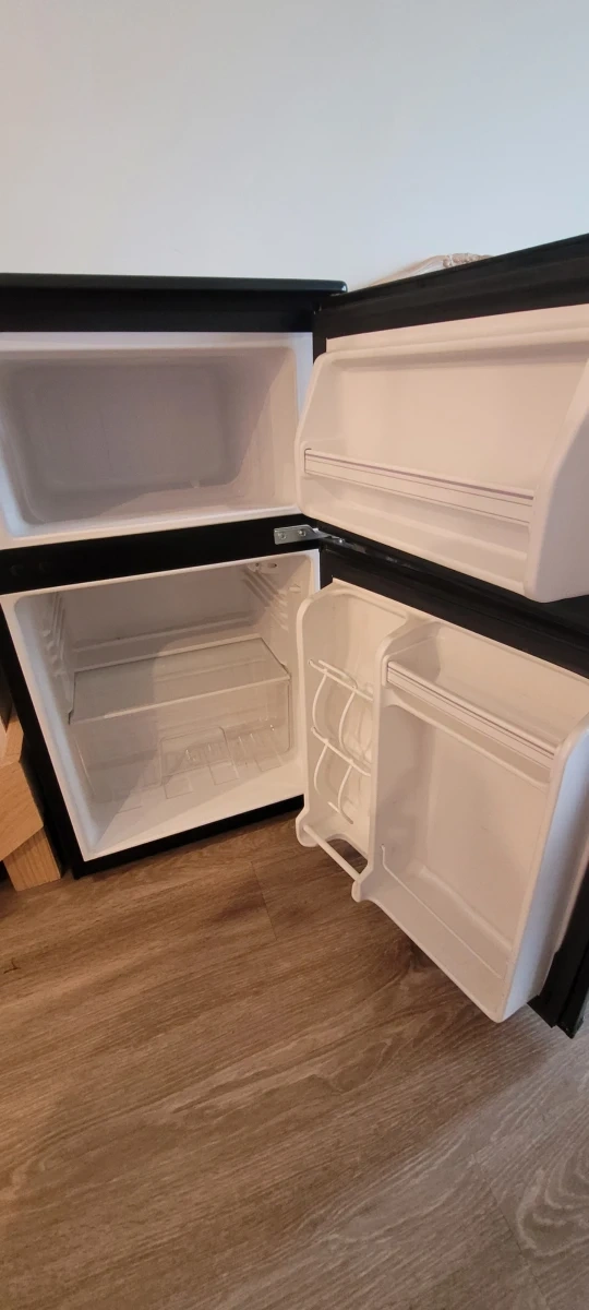 Selling a Chef mini fridge in black. It's in great condition and ready to keep your snacks and drinks cool! Perfect for a dorm room, office, or small apartment. It's compact and doesn't take up much space.