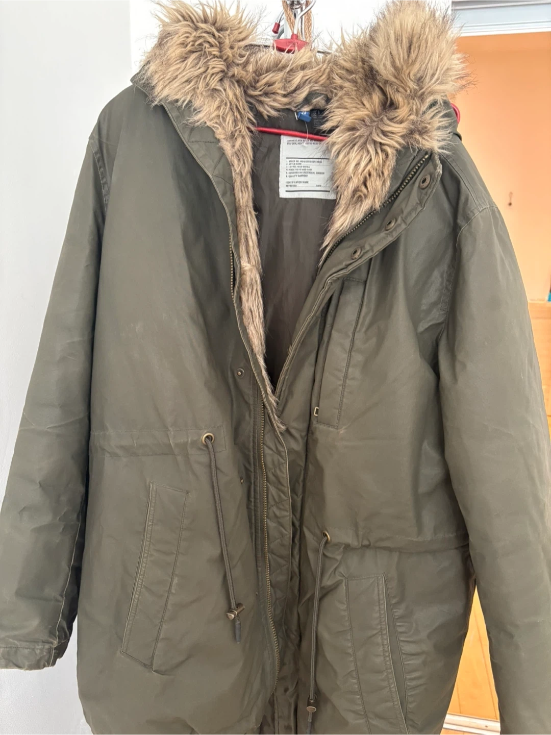This is a stylish olive green parka featuring a cozy faux fur hood. It's perfect for staying warm during the colder months. The parka has a zipper closure and drawstring details. A great addition to your winter wardrobe!