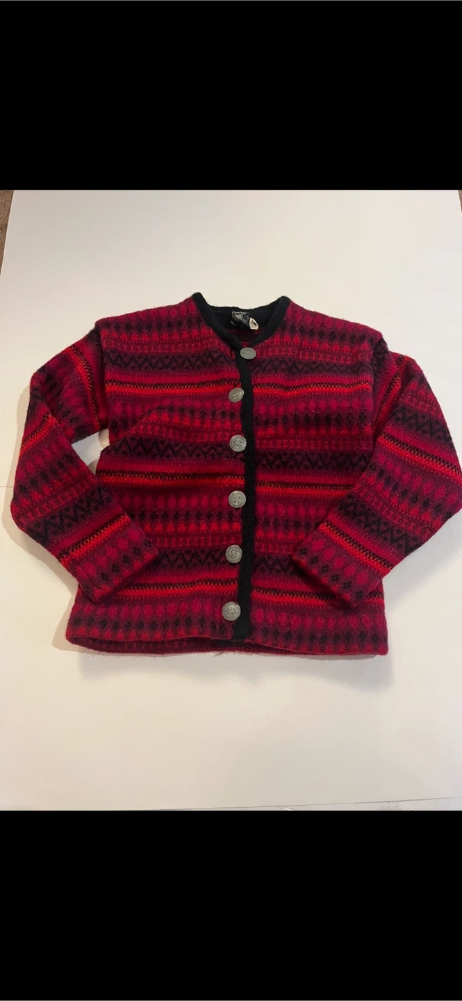 Selling a vintage wool cardigan with a unique red and black pattern. It features silver-tone buttons and a black trim. This cozy cardigan is perfect for adding a touch of vintage charm to your wardrobe!
