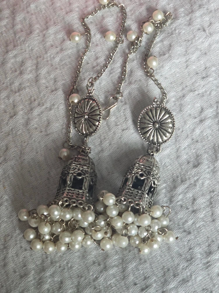 Selling a pair of silver plated antique jhumka earrings with engravings. They have a nice lantern style design and are adorned with pearls. They are in great condition and ready to