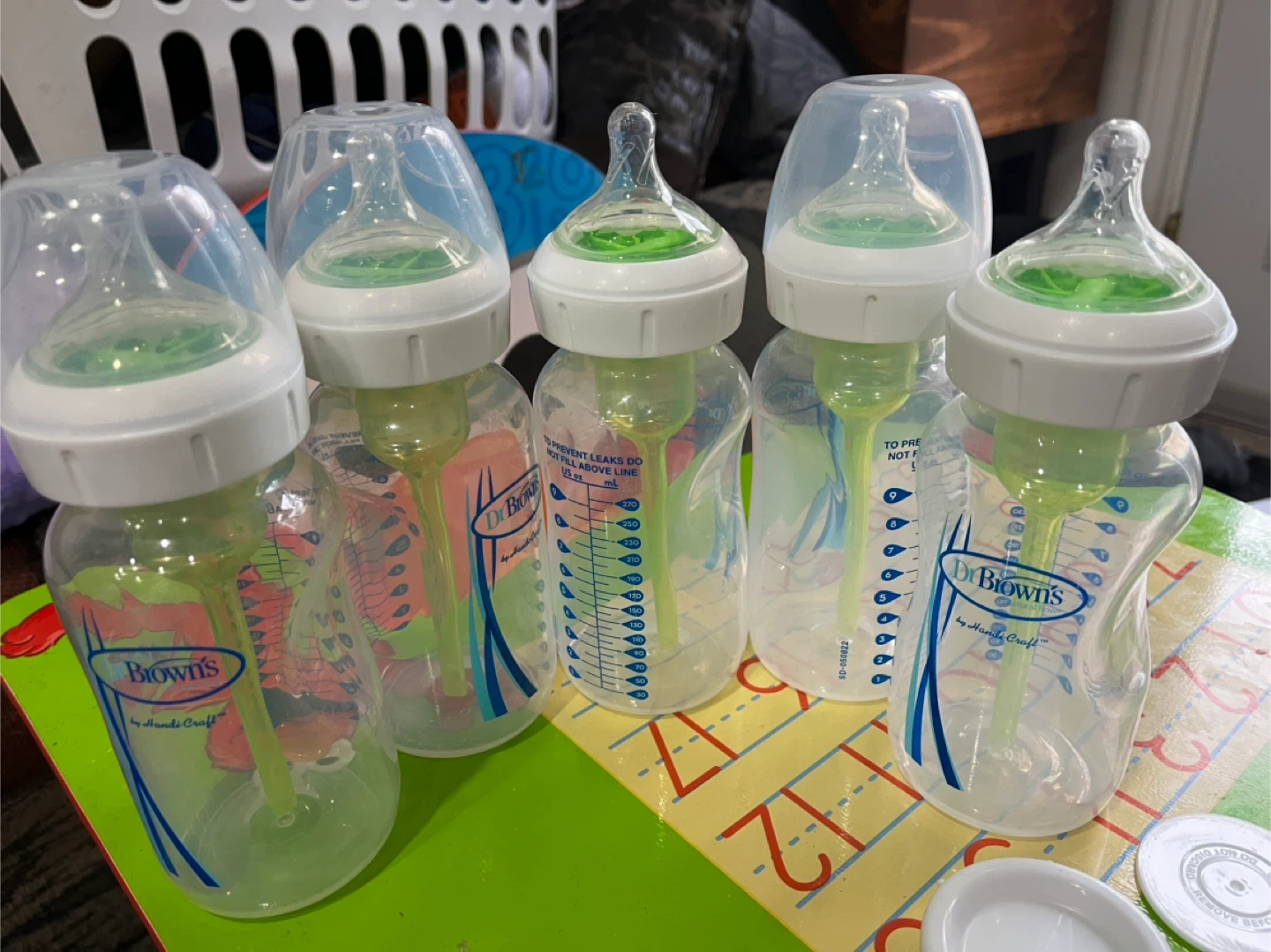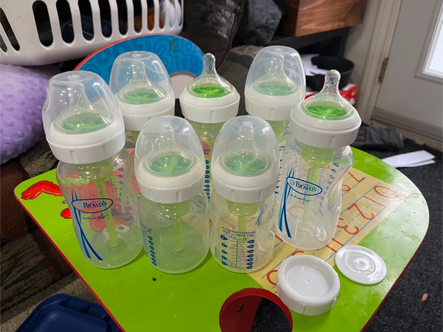 Selling a set of Dr. Brown's baby bottles, barely used maybe once or twice. All washed before put away but have been sitting for 2 years. They are designed to prevent leaks and have a clear measuring scale on the side. Five 9oz bottles and two 5oz bottles all with the anti colic insert. Perfect for feeding your little one!