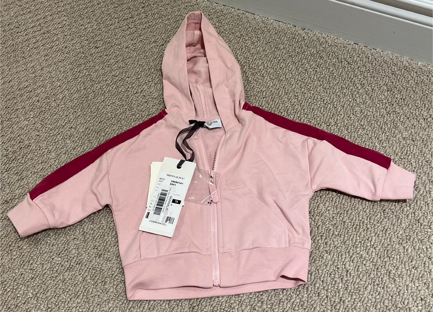 This cute Monnalisa baby girl's pink sweater is brand new. It features a charming design and is perfect for keeping your little one cozy. Size 74, suitable for a 9 month-old baby girl