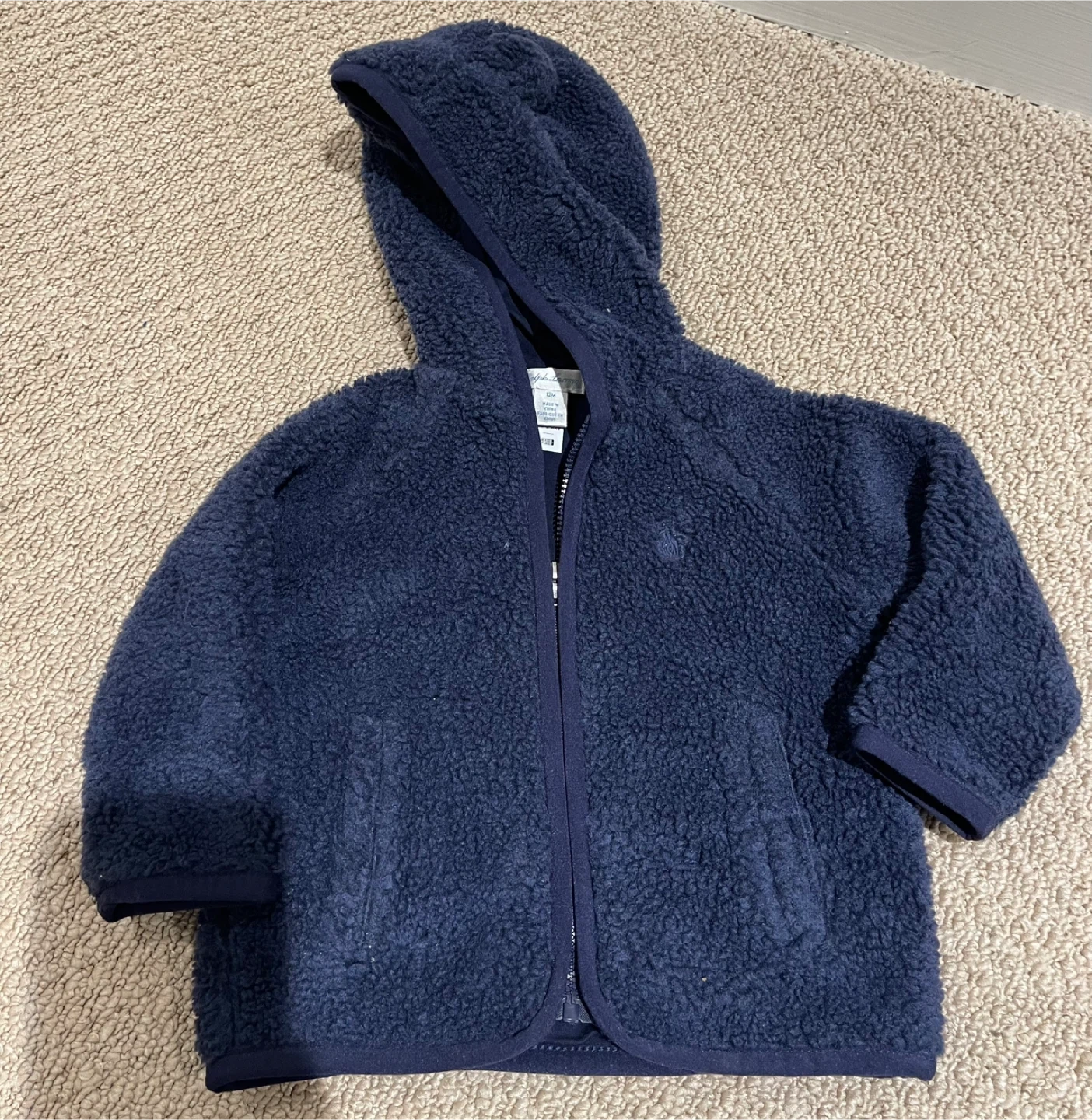 Cozy Ralph Lauren fleece hoodie for your little one! This navy blue hoodie is in new condition and sized for 12 months. Perfect for keeping your baby warm and stylish during cooler weather