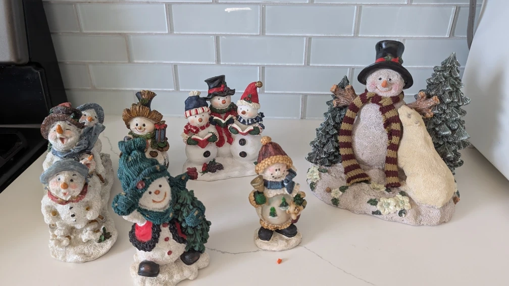 Selling a collection of snowman figurines. They would be perfect for holiday decorations! Please note that one of the snowmen has a crack on the hat.