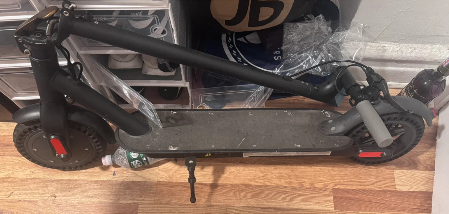 Selling a used black electric scooter. It has some wear and tear, as you can see in the photos, but it's still functional. Perfect for getting around town!