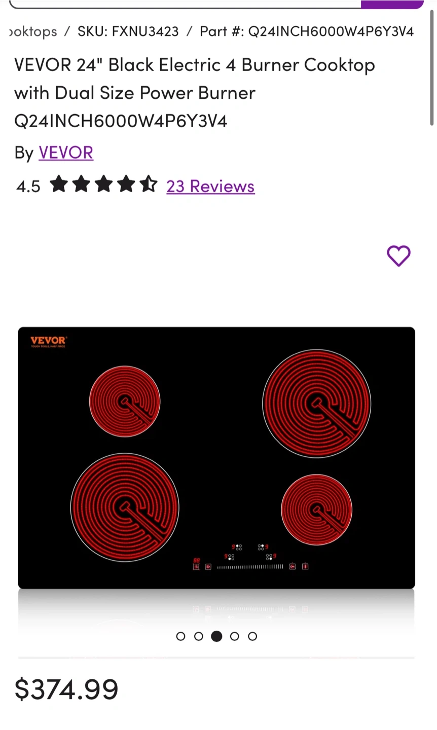This is a VEVOR 24" Black Electric 4 Burner Cooktop with Dual Size Power Burner Q24INCH6000W4P6Y3V4. It originally sold for $374.99.