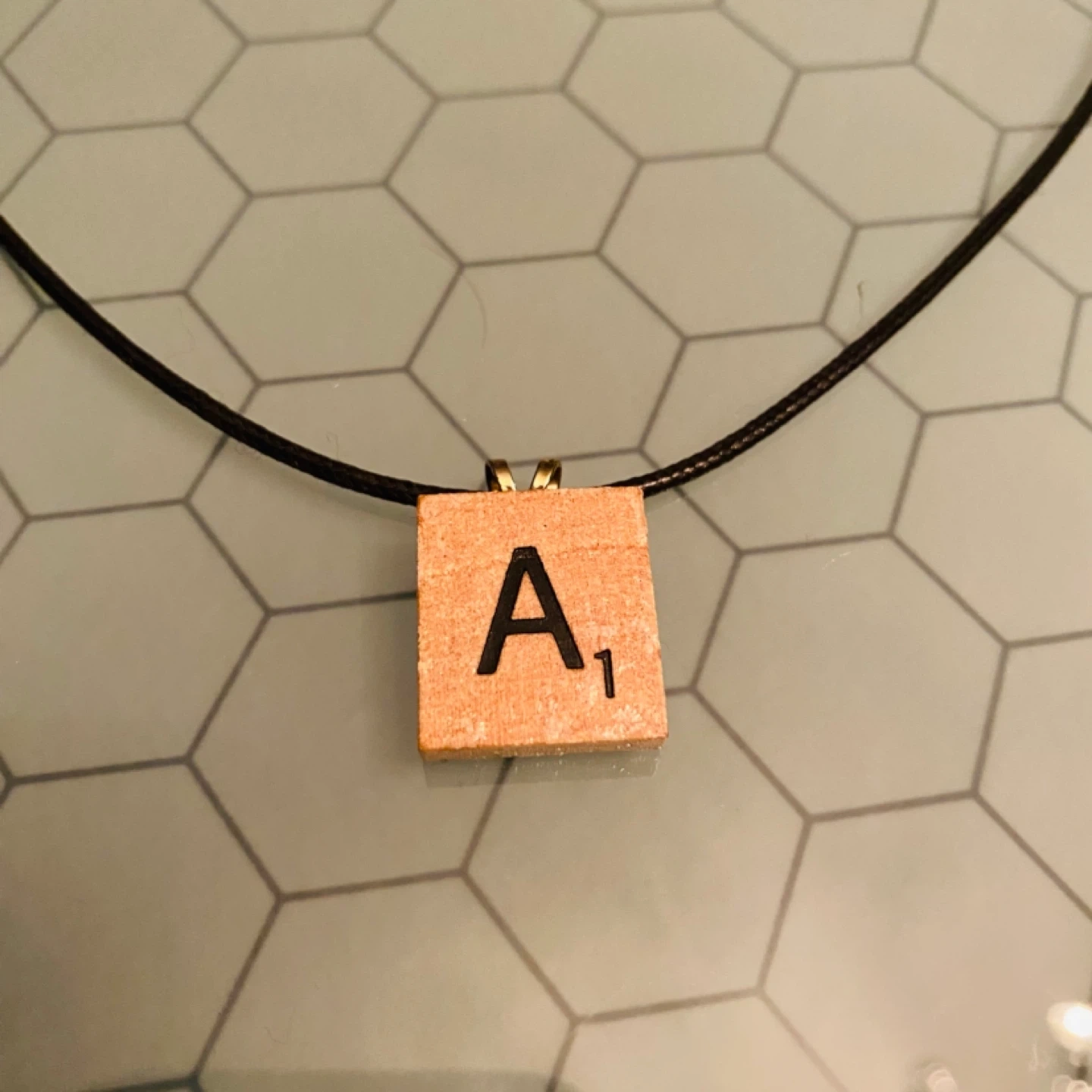 This is a cute pendant necklace featuring a Scrabble tile with the letter 'A' on it! The pendant is attached to a black leather cord necklace. It's a fun and unique accessory to add to your collection.