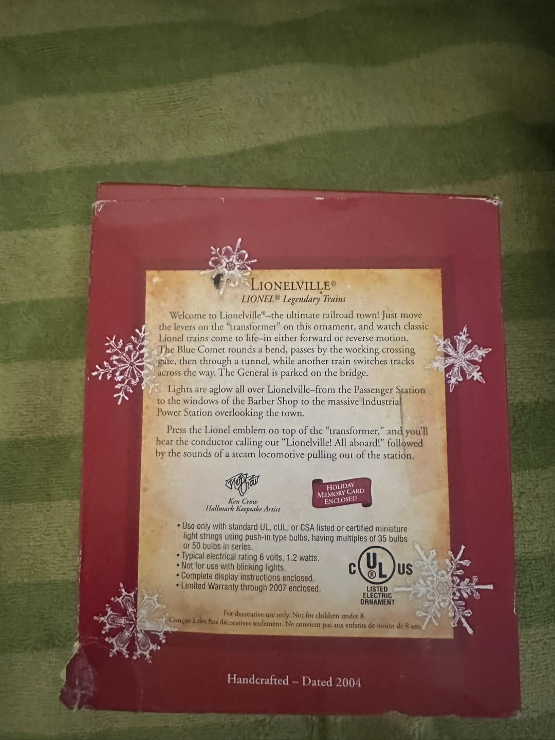 Hallmark Keepsake Ornament from the Lionelville Legendary Trains series! It's a handcrafted piece dated 2004. The ornament features light, motion, and sound, making it a magical addition to your holiday decorations. Perfect for indoor use only and comes with complete display instructions enclosed