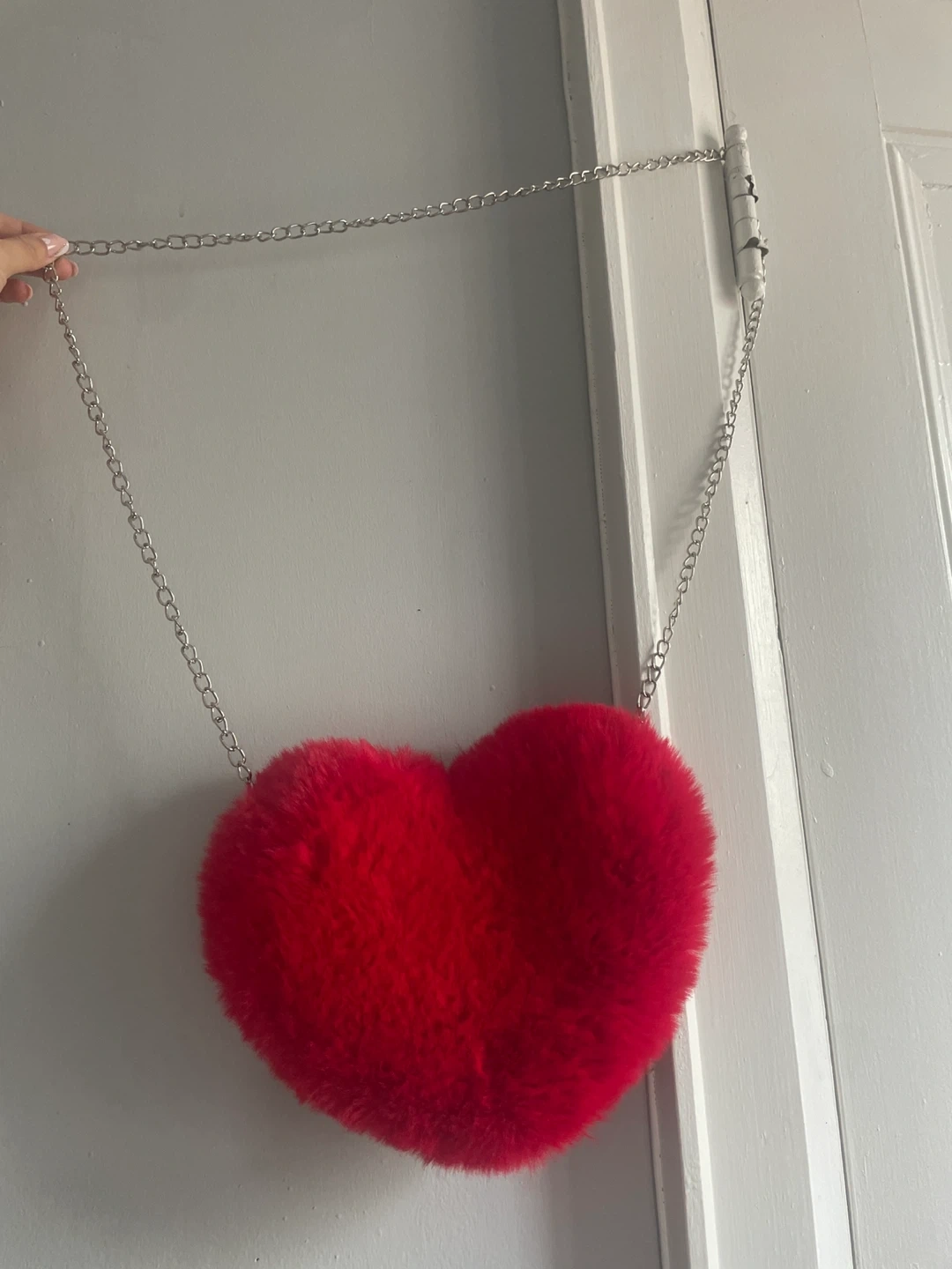 Selling a super cute red heart-shaped purse! It's made of a fuzzy material and has a silver chain strap. Perfect for adding a fun pop of colour to any outfit!