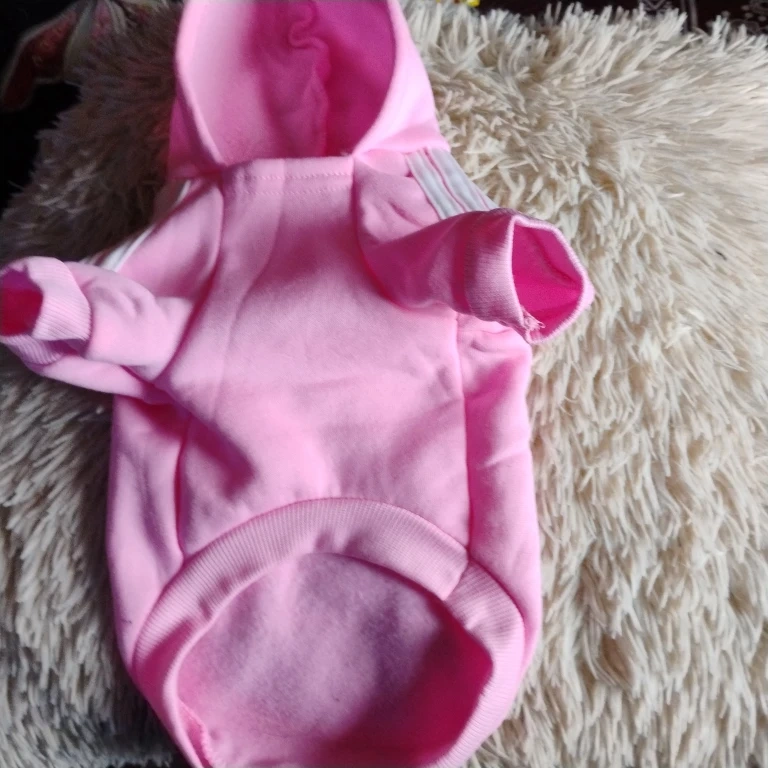 Selling a cute pink Adidog hoodie for your furry friend! It's in great condition and perfect for keeping your pet warm and stylish. The hoodie features the Adidog logo and classic Adidas-style stripes on the sleeves. Size is small.