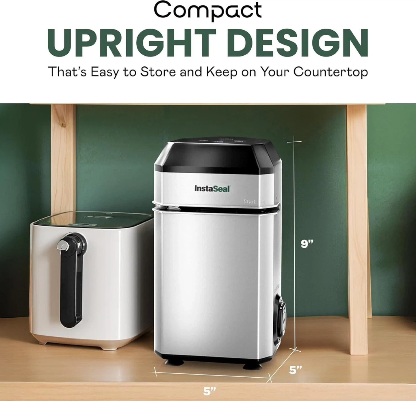 Keep your food fresh longer with the InstaSeal upright bag vacuum sealer! It's great for liquids and features an airtight double seal. The compact upright design is easy to store and keeps liquids from spilling out while vacuum sealing. Dimensions are 9" tall and 5" wide