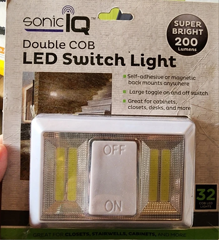 Selling a brand new Sonic IQ Double COB LED Switch Light! It's super bright at 200 Lumens. It has a self-adhesive or magnetic back and is great for cabinets, closets, desks, and more. Perfect for closets, inside cabinets, under cabinet lighting, workbenches, garages, sheds, cars, boats, RVs and more! Product measures 4.5" x 3" x 1".