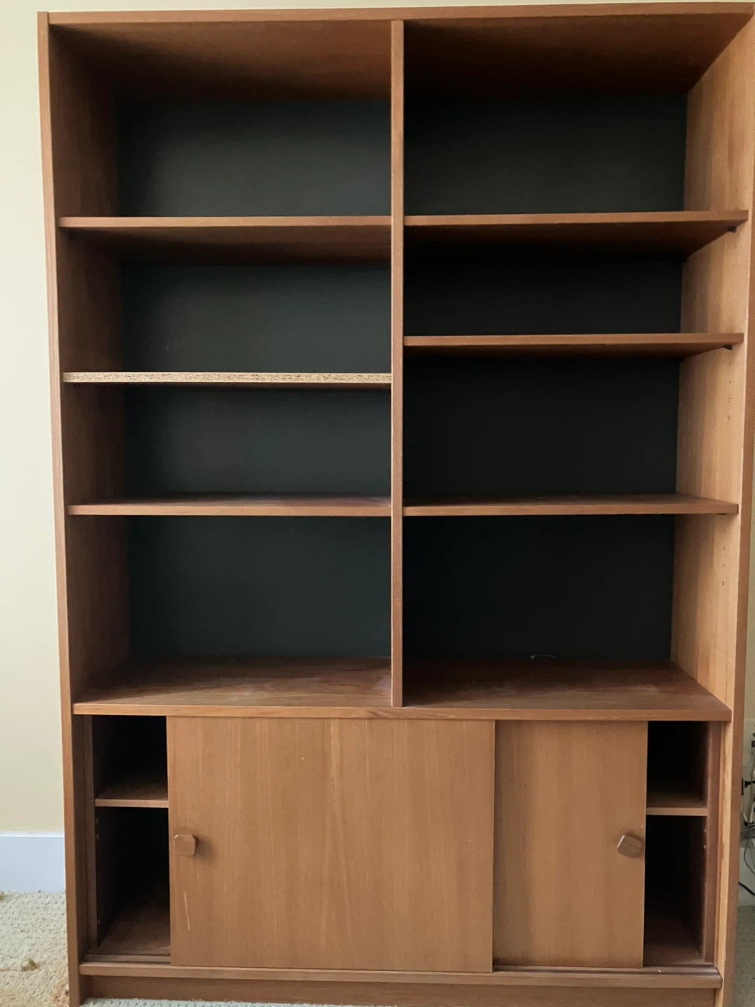 Selling a wooden bookcase, perfect for adding storage and style to any room! It features open shelving on top and sliding doors at the bottom for concealed storage. A great piece for organizing books, decor, or anything you need to keep tidy the wood made of teak