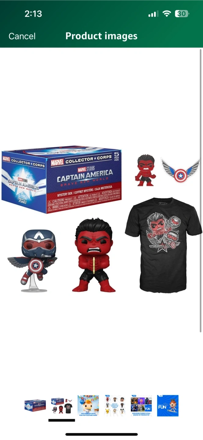 Selling a Funko Marvel Collector Corps Captain America Brave New World mystery box! Includes Captain America and Red Hulk Funko Pops, a t-shirt, and other collectibles. A great set for any Marvel fan!