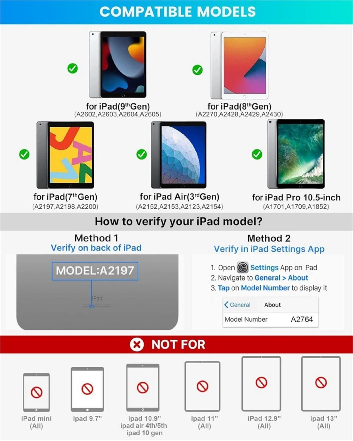 This Typecase keyboard case is compatible with iPad 9th Gen (A2602, A2603, A2604, A2605), iPad 8th Gen (A2270, A2428, A2429, A2430), and iPad 7th Gen (A2197, A2198, A2200)
