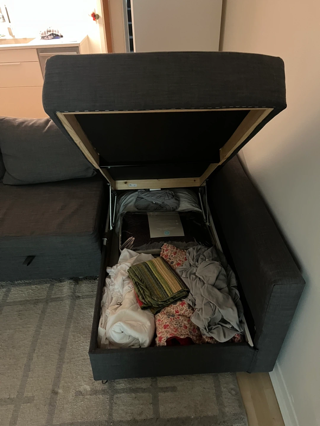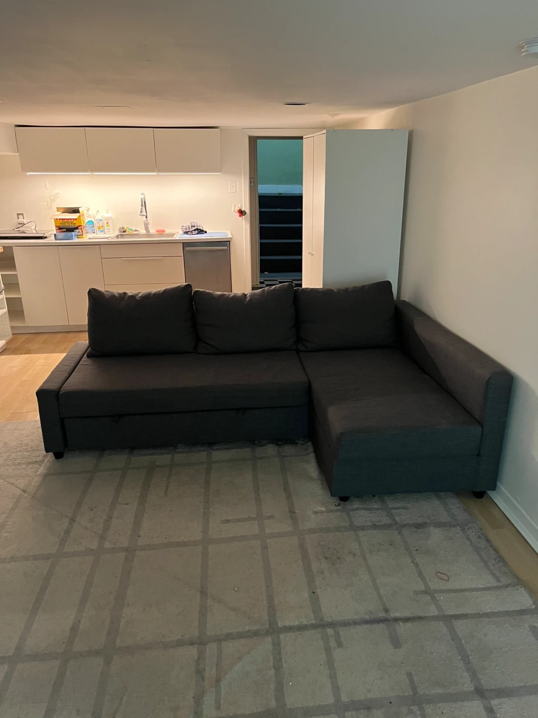 Selling a gently used IKEA Kivik sleeper sectional sofa in dark grey. It's in great condition and super comfy for lounging! The sectional also pulls out into a sleeper, perfect for guests. Plus, it has built-in storage for blankets and pillows. Great for small spaces!