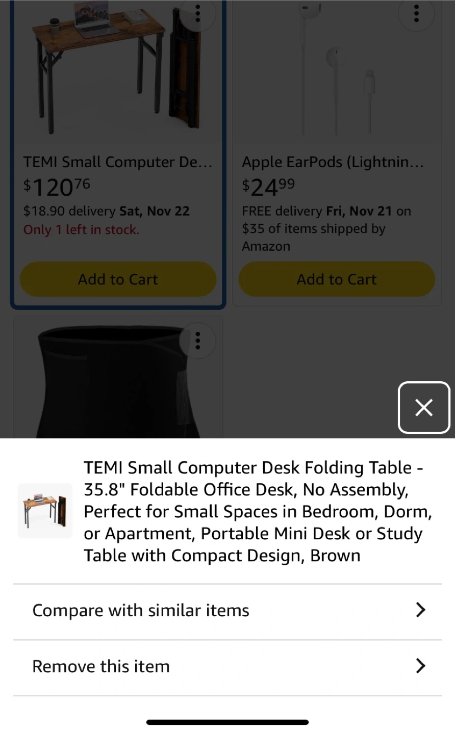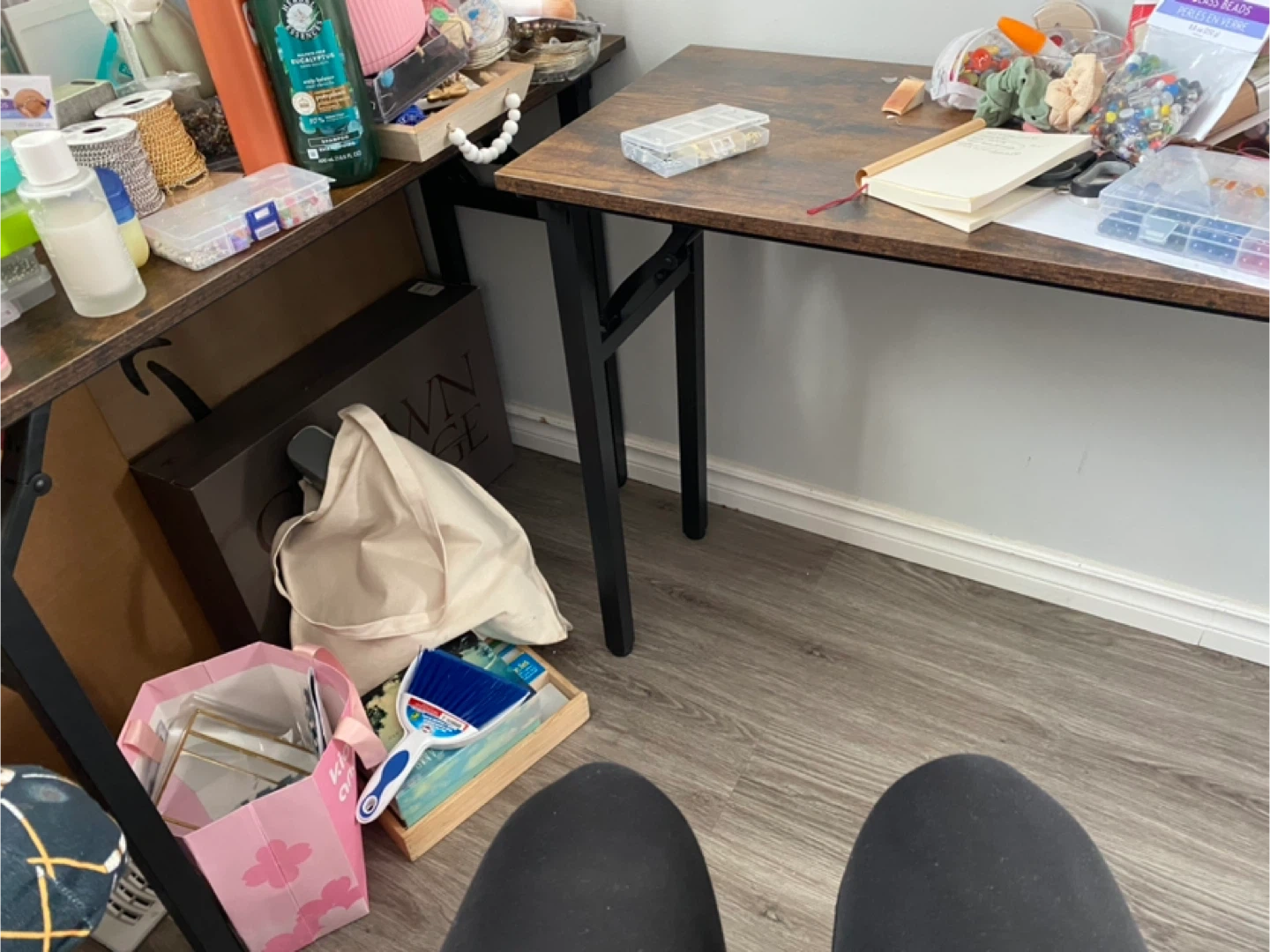 Selling a TEMI Small Computer Desk Folding Table in brown. It's a 43" foldable office desk, perfect for small spaces like a bedroom, dorm, or study.
