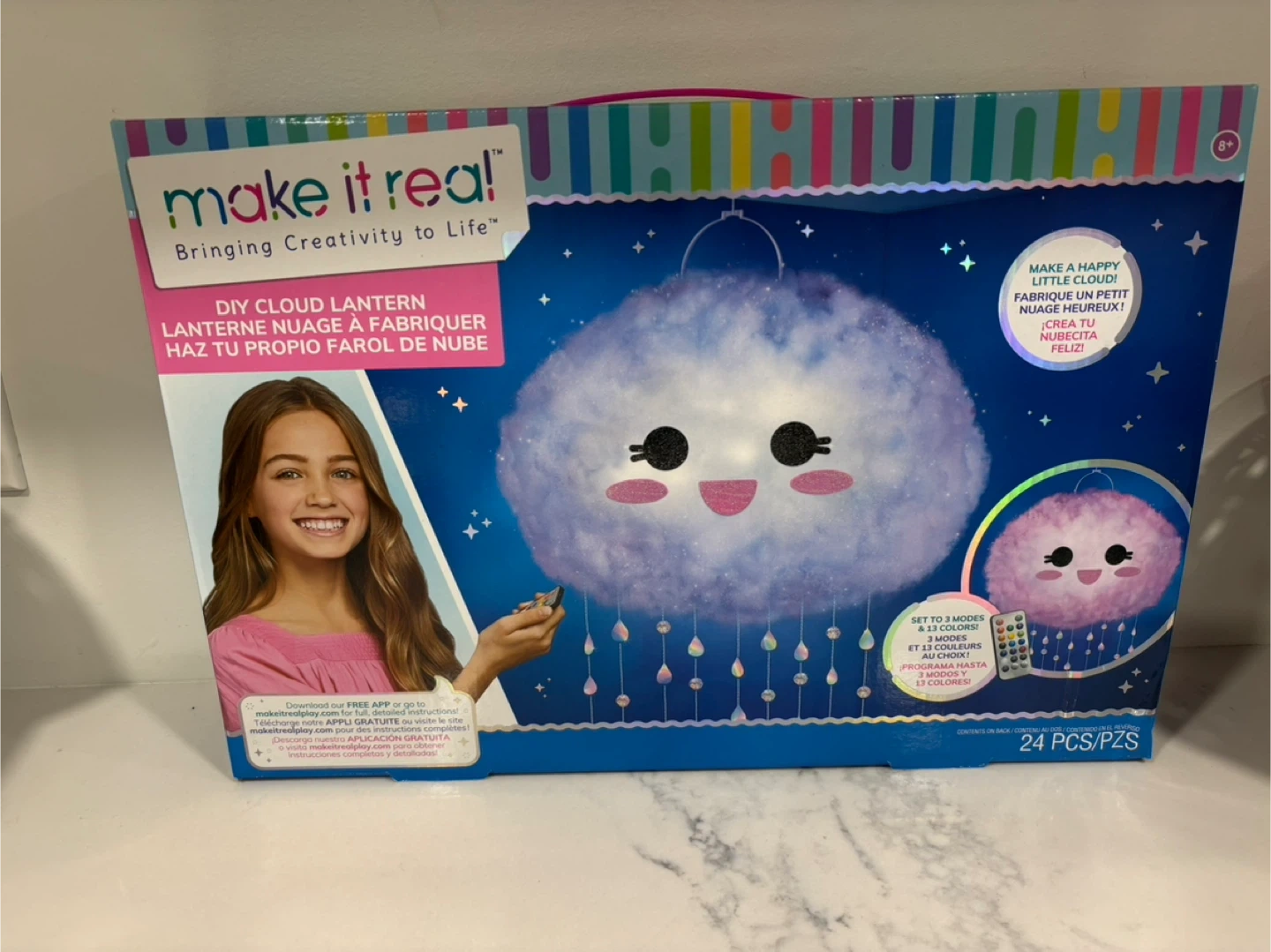 Get creative with this Make It Real DIY Cloud Lantern kit! It includes everything you need to make a happy little cloud light. The kit contains a nylon lantern, support, LED light strip, remote control, polyester fluff, tube of glue, sponge paint brush, acrylic yarn, sheet of rainbow stickers, and round faceted beads. It's a fun and engaging project for ages 8+