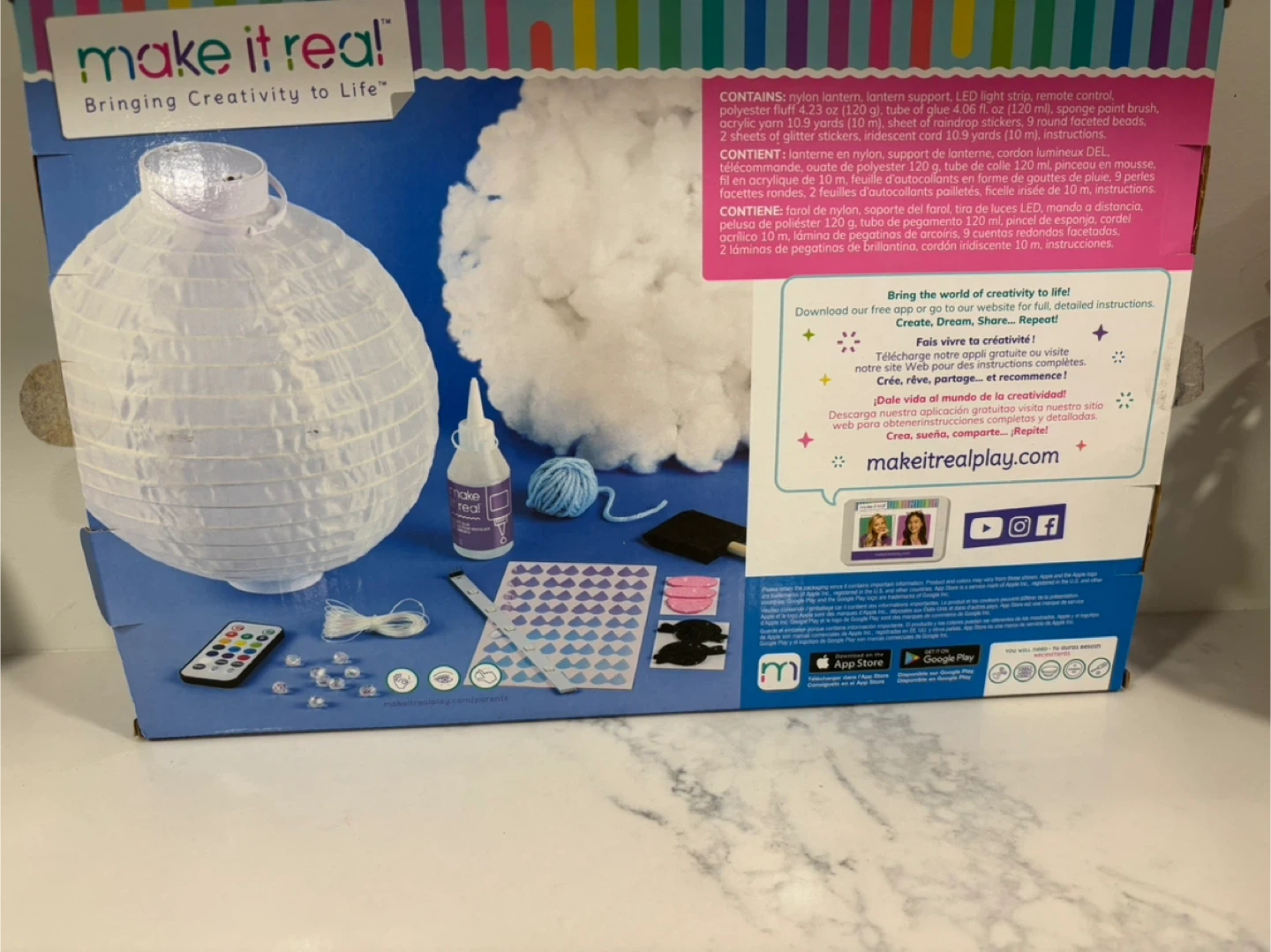 Get creative with this Make It Real DIY Cloud Lantern kit! It includes everything you need to make a happy little cloud light. The kit contains a nylon lantern, support, LED light strip, remote control, polyester fluff, tube of glue, sponge paint brush, acrylic yarn, sheet of rainbow stickers, and round faceted beads. It's a fun and engaging project for ages 8+