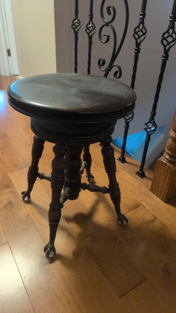 Selling a charming antique piano stool with a dark wood finish. It features a swivel seat and unique claw feet! It would make a lovely addition to any home