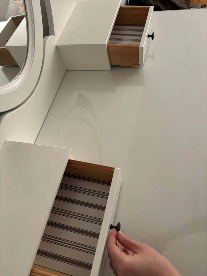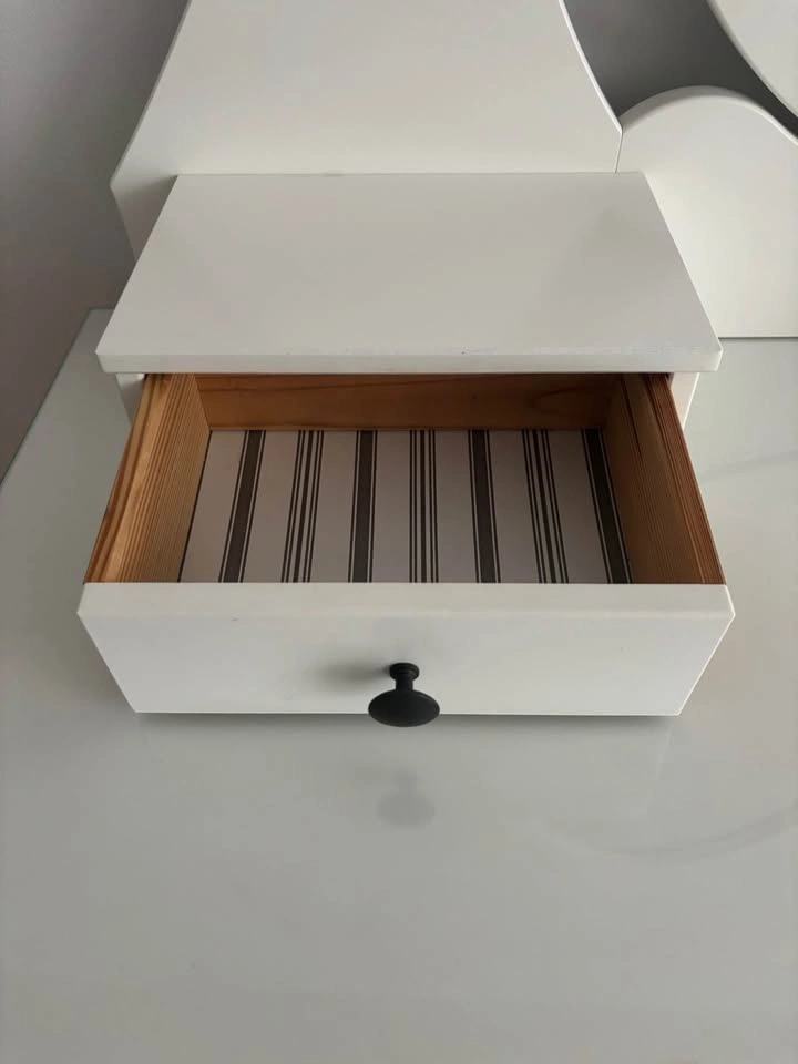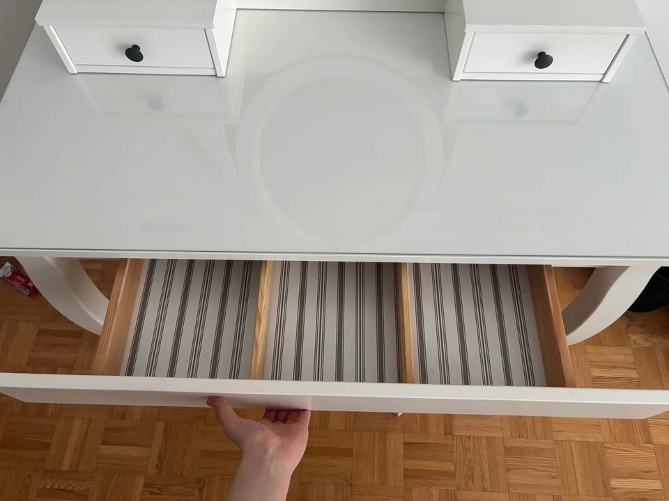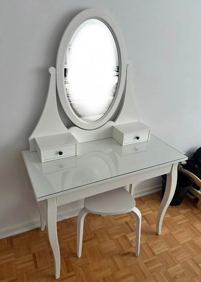 IKEA HEMNES vanity table and matching stool in great condition. Glass tabletop, two small drawers on top and one large drawer underneath. The top piece can be separated for easier moving.