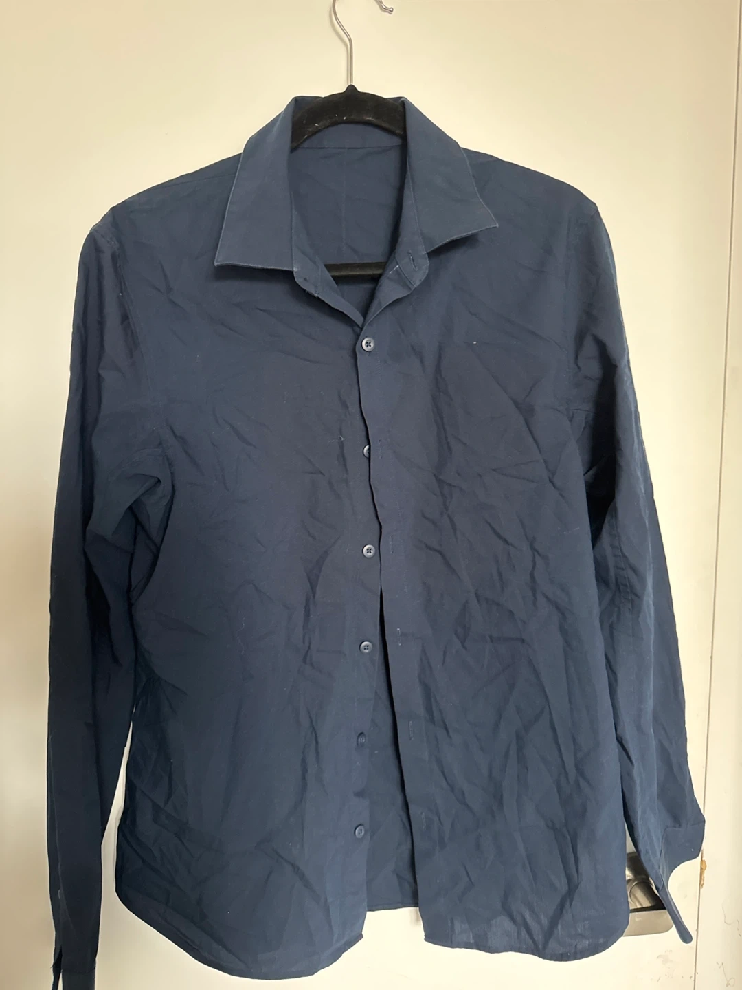 Here's a navy blue button-down shirt! It's in great condition and ready for a new home. Perfect for dressing up or down, this shirt is a versatile addition to any wardrobe