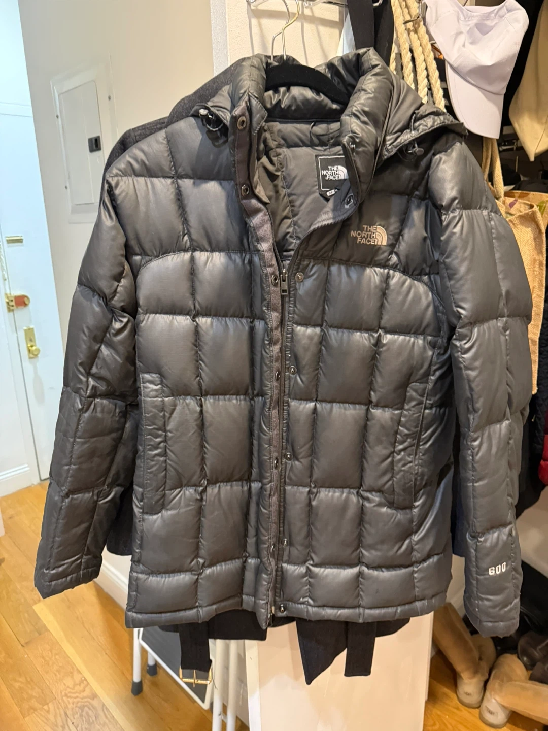 Selling a The North Face puffer jacket. It's a stylish and warm jacket, perfect for colder weather. It features a classic design and is in good condition. The color is a versatile grey. It's a size that fits comfortably and provides excellent insulation. The jacket also has a '600' fill power, indicating its warmth and quality