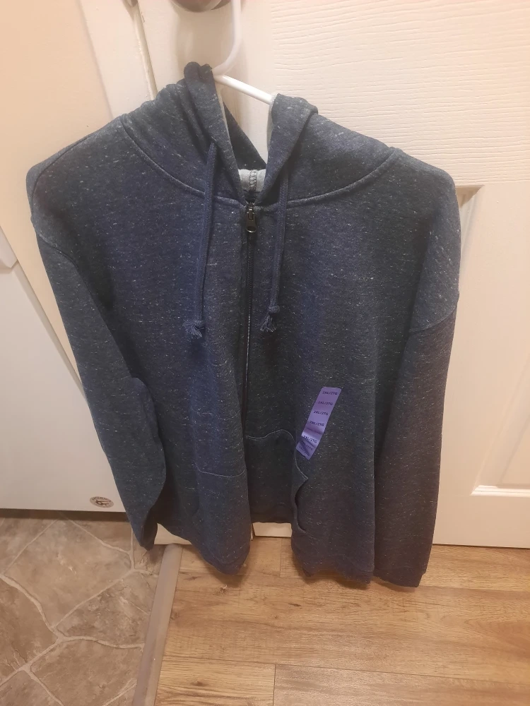 The item pictured is a navy blue zip-up hoodie. It is a type of casual outerwear, typically made from a blend of cotton and polyester, featuring a drawstring hood and front pockets. 2xL men's