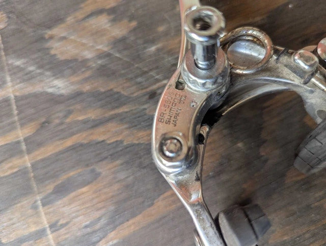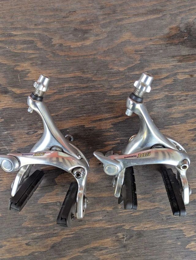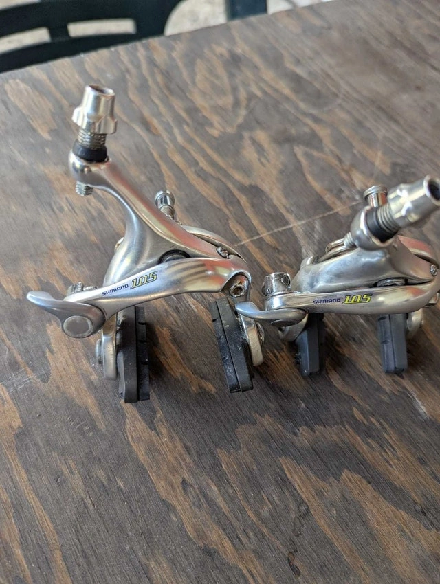 I'm selling a set of used Shimano 105 brake calipers, known for their reliable performance and durability. These calipers are a great upgrade for any road bike, offering excellent stopping power and modulation. They are in good working condition, showing some signs of wear and tear consistent with their age. Here are some details: