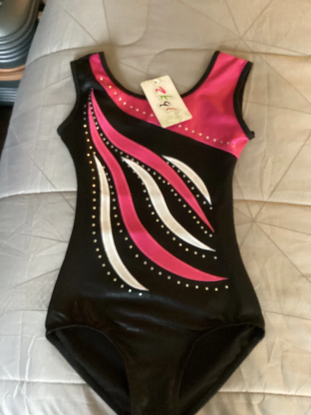 This ZGL gymnastics leotard is new with tags and ready for any gymnast! It's a size 9-10Y and features a stylish design with pink, white, and silver sparkly accents on a black shimmery base. Make a great gift