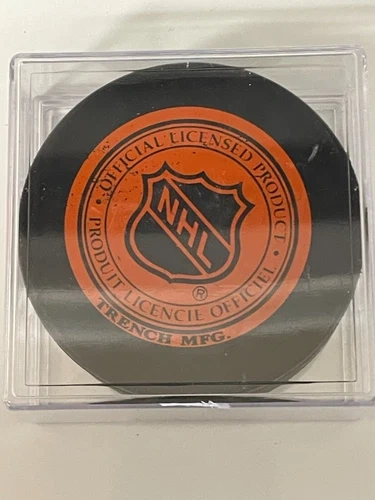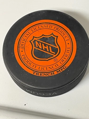 This vintage Boston Bruins game puck is signed by NHL player Ray Bourque and comes with an original and authentic Trench made in Slovakia. The puck is a great addition to any sports memorabilia collection, especially for fans of the Bruins and the Stanley Cup. The signature is genuine and adds a unique touch to the item, making it a valuable and rare find for any hockey enthusiast. Whether you are a collector or a fan of the sport, this puck is a must-have for any display or showcase.