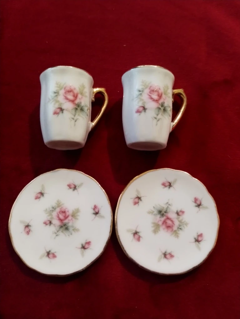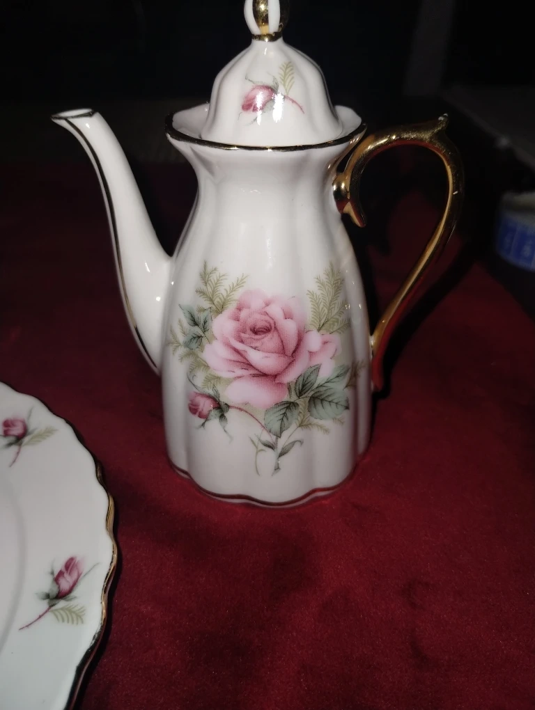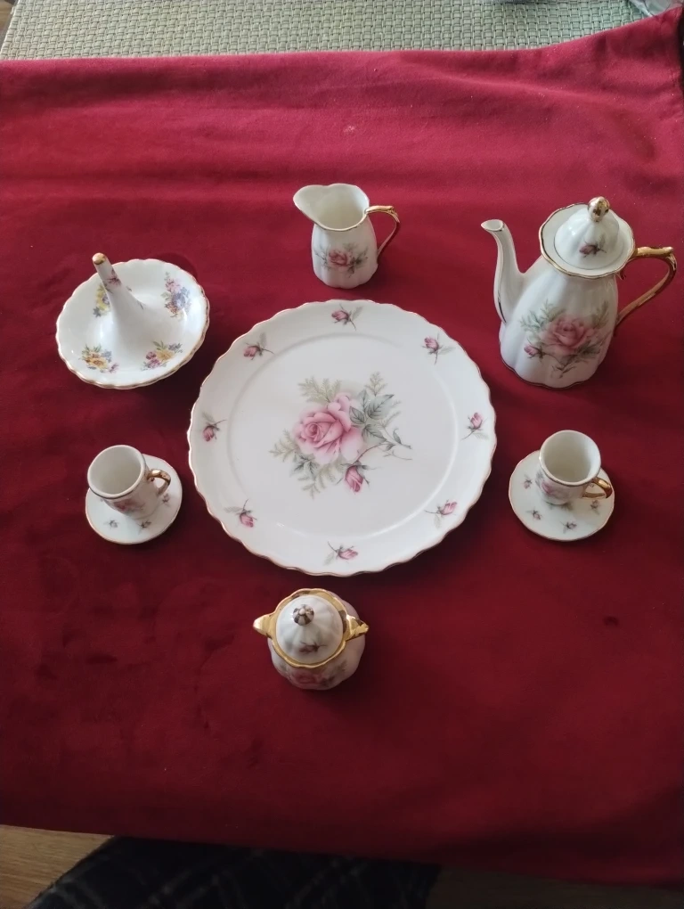 Selling a SMALL, DECORATIVE and LOVELY vintage tea set with a delicate floral design! It includes a teapot, creamer, sugar bowl, two cups and saucers, a plate, and a ring holder. Perfect for decoration.