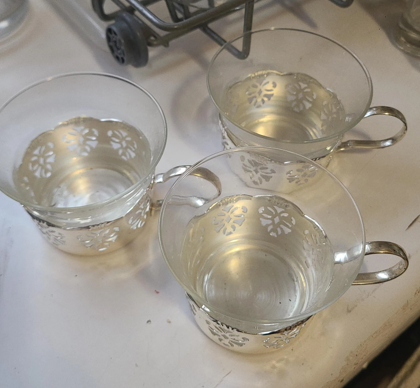 Selling a set of vintage glass tea cups with delicate silver-plated holders. They add a touch of elegance to any tea time! The cups are in great condition and ready for a new home