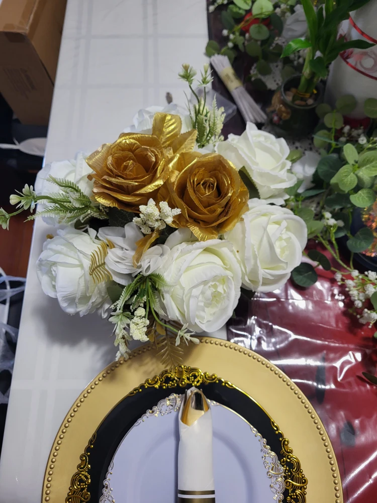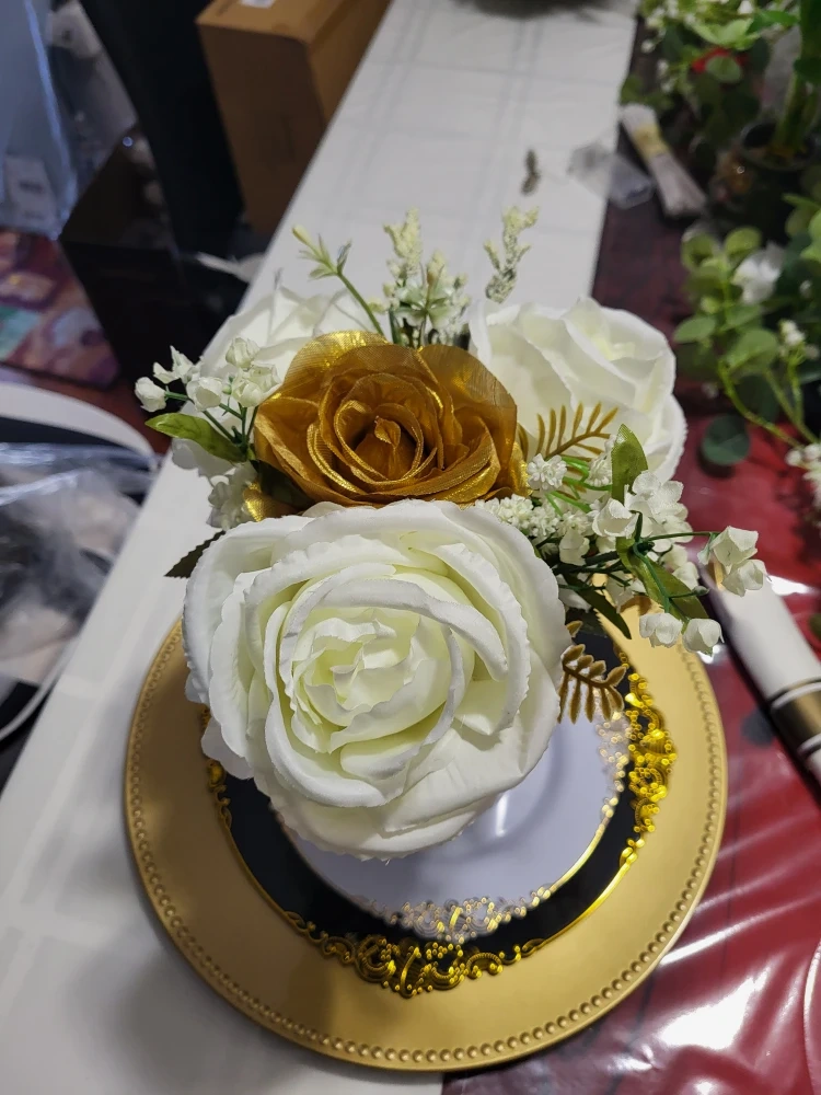 Beautiful floral centerpiece featuring white and gold roses! Perfect for weddings, parties, or home decor! This centerpiece will add a touch of elegance to any event or space,hand made