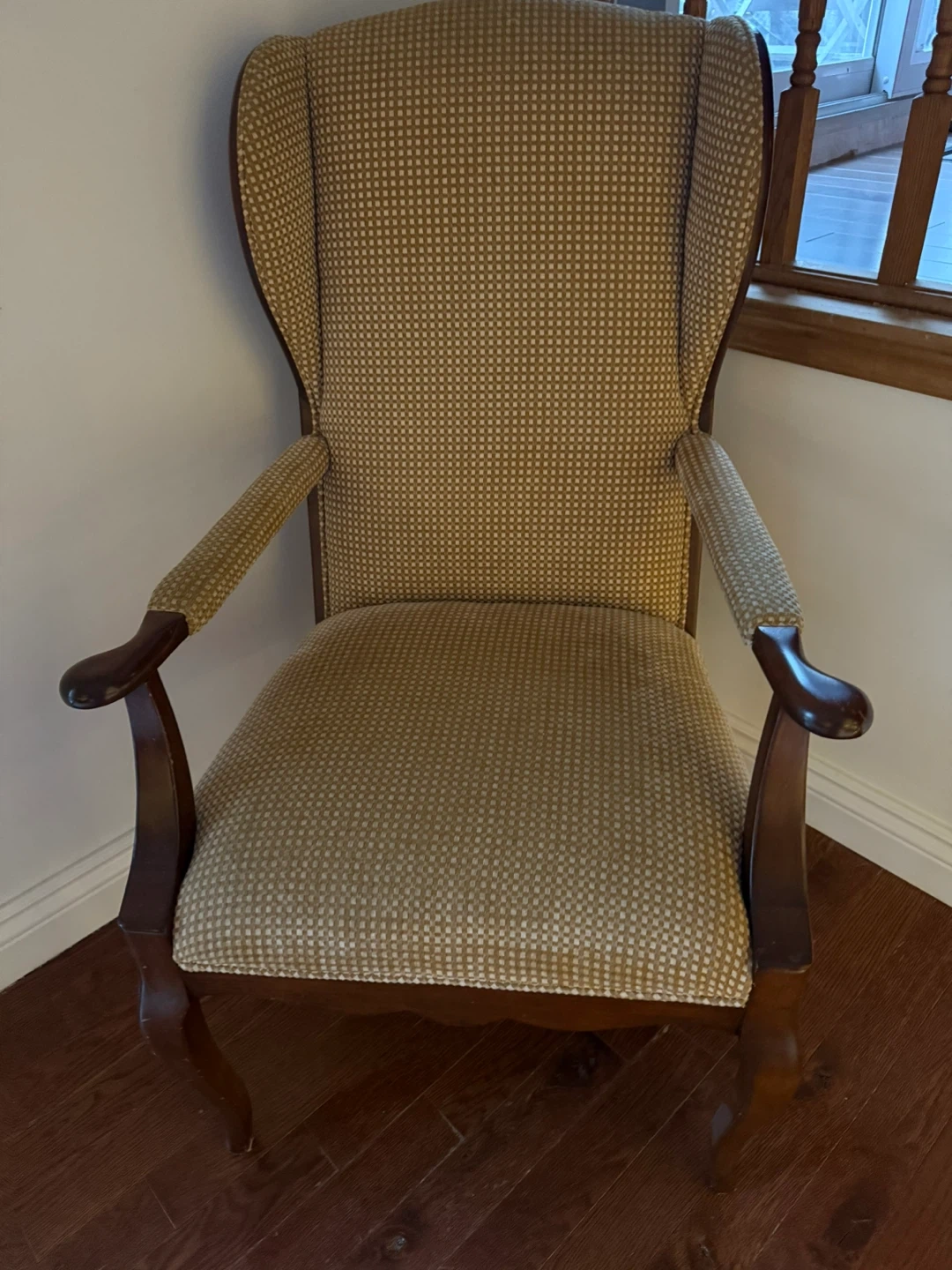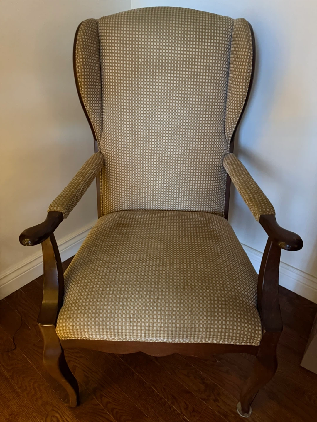 Selling two classic wingback armchairs! It features a neutral patterned fabric and dark wood accents. It's a comfortable and stylish addition to any living space, adding a touch of elegance to your home