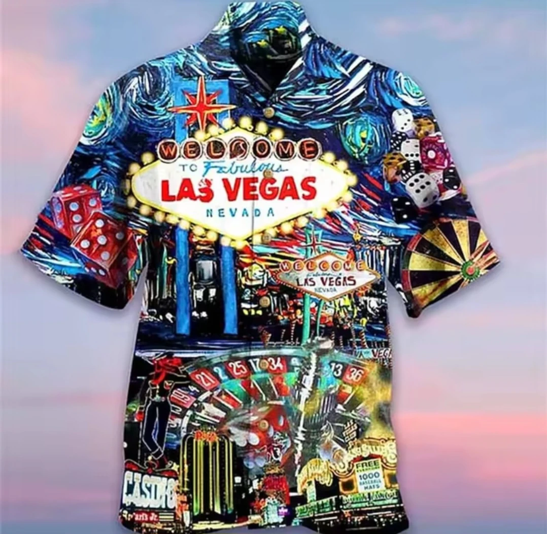 Fun and vibrant Las Vegas themed button-up shirt! Features iconic Vegas imagery like the 'Welcome to Fabulous Las Vegas' sign, dice, roulette wheels, and casino scenes. Perfect for adding a touch of Vegas flair to your wardrobe