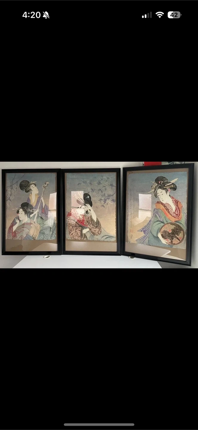 Selling a set of three framed prints featuring Japanese Geisha art. They are in great condition and ready to hang in your home A VERY LARGE MIKULAS KRAVJANSKY SIGNED AND NUMBERED 66/100 INTAGLIO TRIPTYCH TITLED "HANASHI" A Very Large Mikulas Kravjansky Signed And Numbered 84/100 Intaglio Triptych Titled "HANASHI". Frame Measure 39" X 77". Bio: Mikulas Kravjansky was born in Czechoslovakia, May 3, 1928, he studied art and scenography at the Academy of Muses Art in Czechoslovakia. He was primarily interested in set and costume design, designing interiors and graphic art. He was a chairman of the art department of the State Television and created many designs for operas, ballets and theatrical productions. Before leaving Europe in 1968 his designs and paintings were exhibited in Prague, Budapest and Vienna. Internationally he has had shows from Paris and Berlin to Cairo and the Sao Paulo Brennala. Since his arrival in America, he has had exhibitions in New York and Toronto as well as a traveling show of his works throughout South America.Mikulas Kravjansky dabbles in a plethora of artistic mediums and subject matter, including: Landscapes, paintings, Intaglio, Engravings, Prints, Oils, Metaphysic pictures, Floral pictures, Graphic art, etchings, Canadian landscape. By combining traditional techniques of etchings and collagraph with his own process of dry point on copper over soft surface, he is able to use creative methods to reflect the richness and variety of his perceptions about our contemporary environment. He has resided in Canada, Florida and California, where he had his own art publishing company, creating and printing limited editions of graphic art. Now he is back in Canada and living at the shores of Georgian Bay, where, in his studio, he is painting pictures, writing poetry and cookbooks. ALL ITEMS ARE SOLD AS IS!. Artist or Maker Mikulas Kravjansky Medium Paper, Mixed Technique
