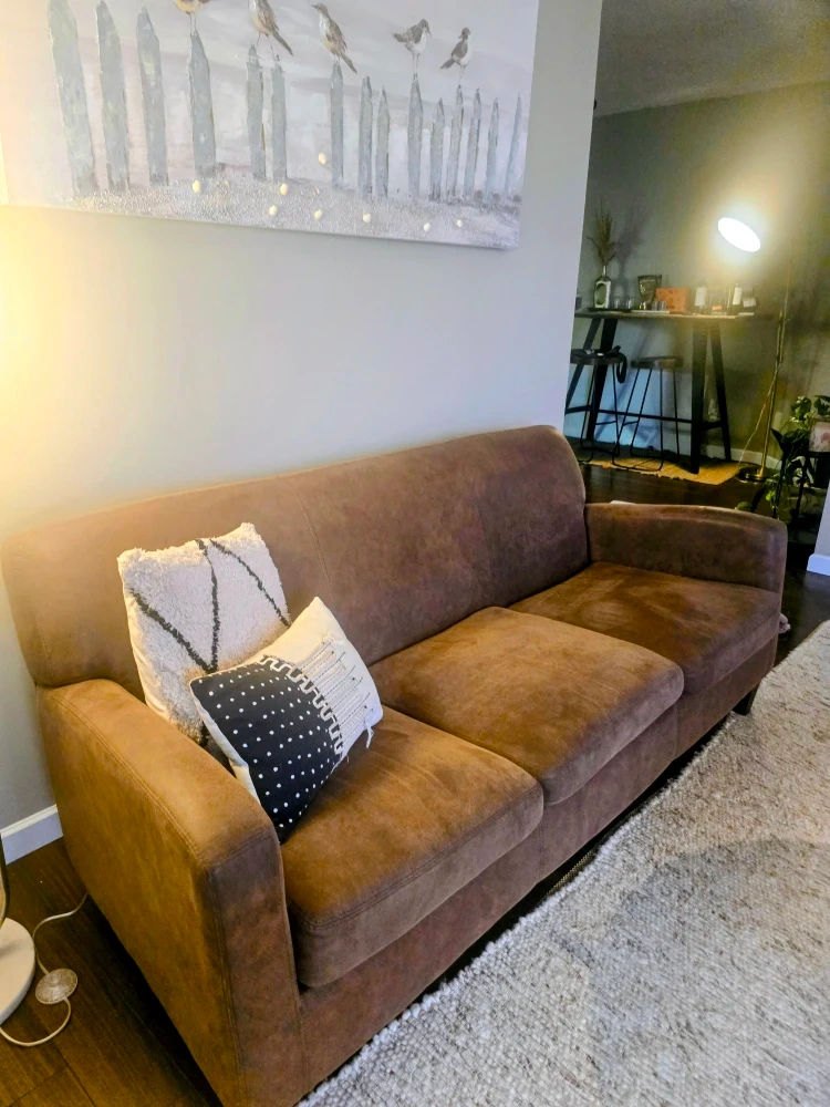 Looking to rehome this comfy brown sofa! It has a soft, suede-like feel and is in great shape. Perfect for a living room or den. Super comfortable and the material is very forgiving — spills wipe off easily and don’t leave any marks