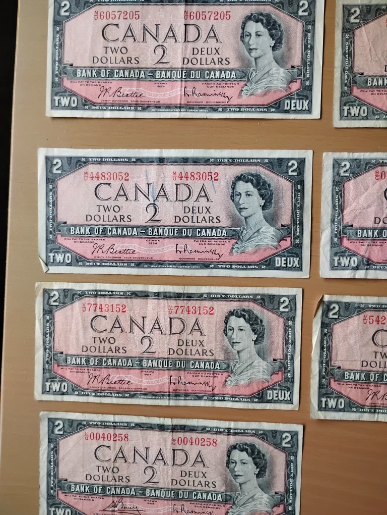 Selling a collection of vintage Canadian two-dollar bills! Each bill features a portrait of Queen Elizabeth II and is from the Bank of Canada. A cool piece of Canadian history! 7$ each or all 7 for 35$