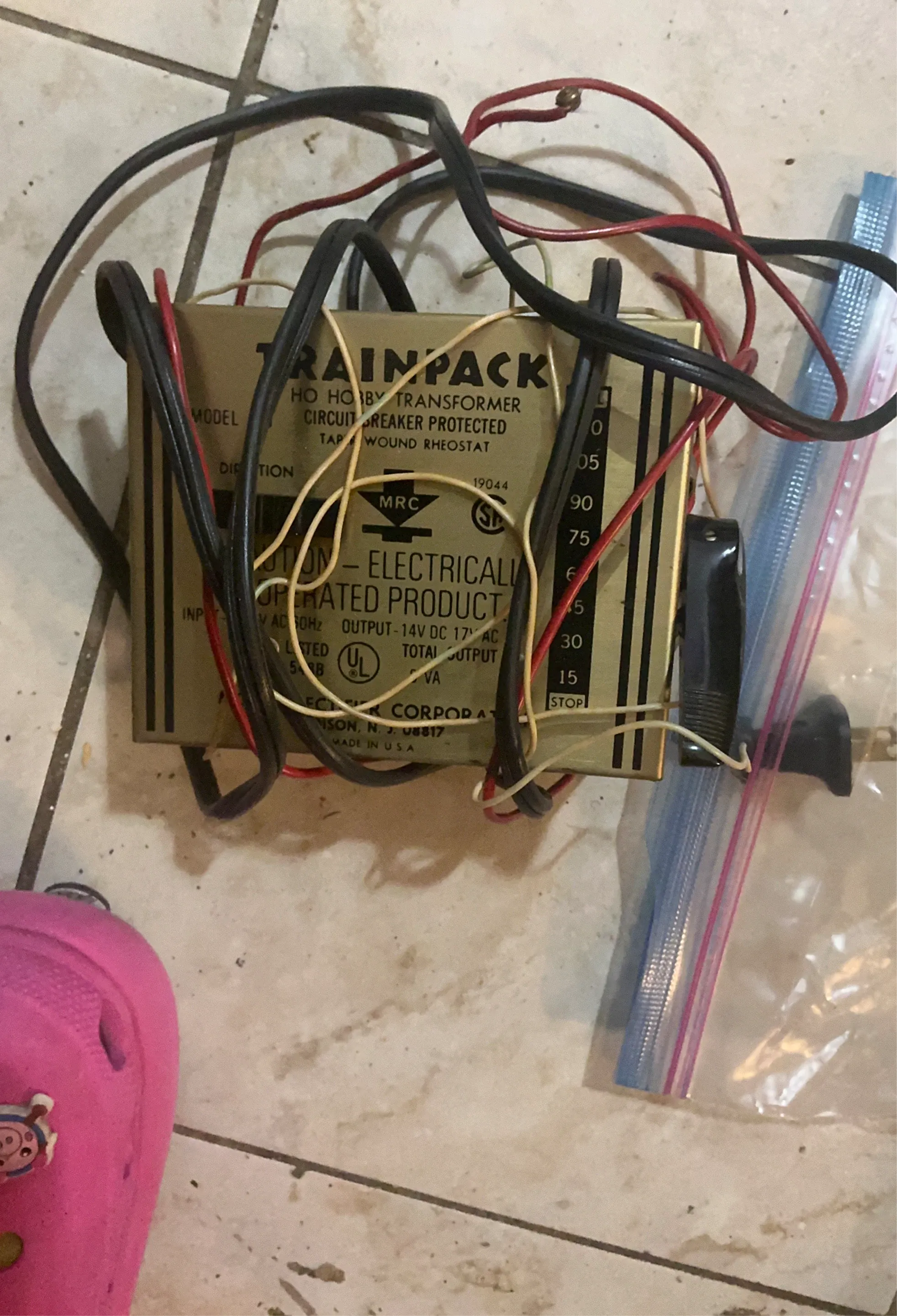This is an MRC Trainpack HO Hobby Transformer, a circuit breaker protected unit. It operates on AC input and has a total output of 14V DC, 17V AC. Made in the USA.