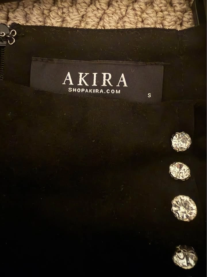 AKIRA black mini skirt with a chic front slit and sparkling rhinestone button details for a glam night-out look. Tag size S, but it was professionally altered (sewn) and now fits like an XS. Sleek, structured fit with a back zip closure—perfect for parties, dinners, and holiday events. Like new condition (5/5).