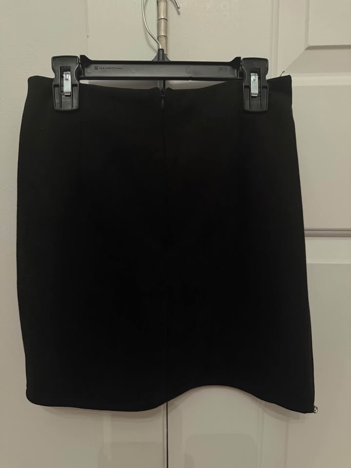 AKIRA black mini skirt with a chic front slit and sparkling rhinestone button details for a glam night-out look. Tag size S, but it was professionally altered (sewn) and now fits like an XS. Sleek, structured fit with a back zip closure—perfect for parties, dinners, and holiday events. Like new condition (5/5).