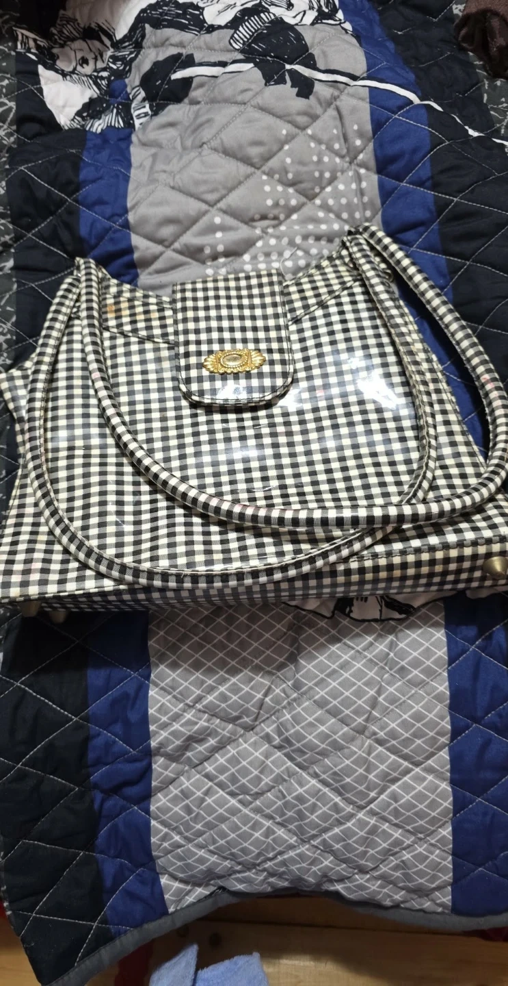 A stylish black and white gingham handbag with a clear overlay. Features a secure flap closure with a decorative gold-toned accent. It's perfect for adding a touch of vintage flair to any outfit!
