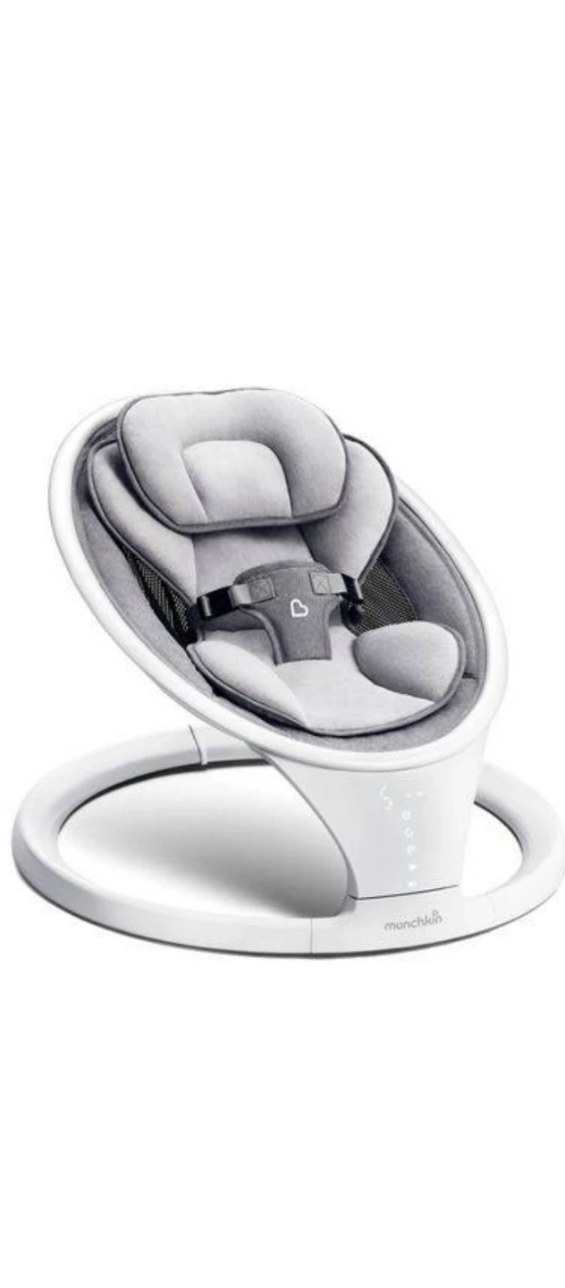 A grey and white Munchkin lightweight baby swing. It's designed for comfort and portability. The swing has multiple gentle motion options. It's suitable for infants needing a soothing place to rest.