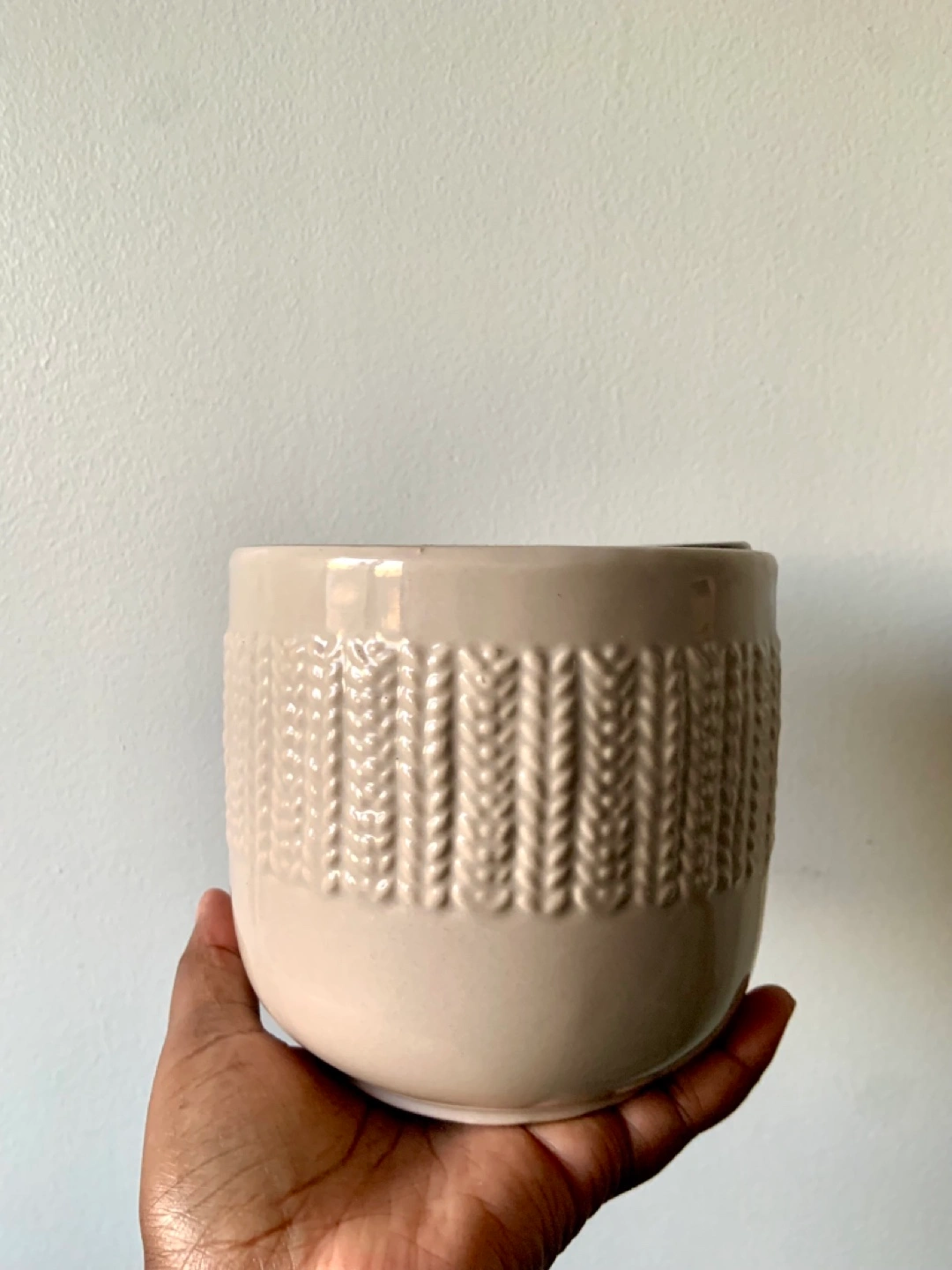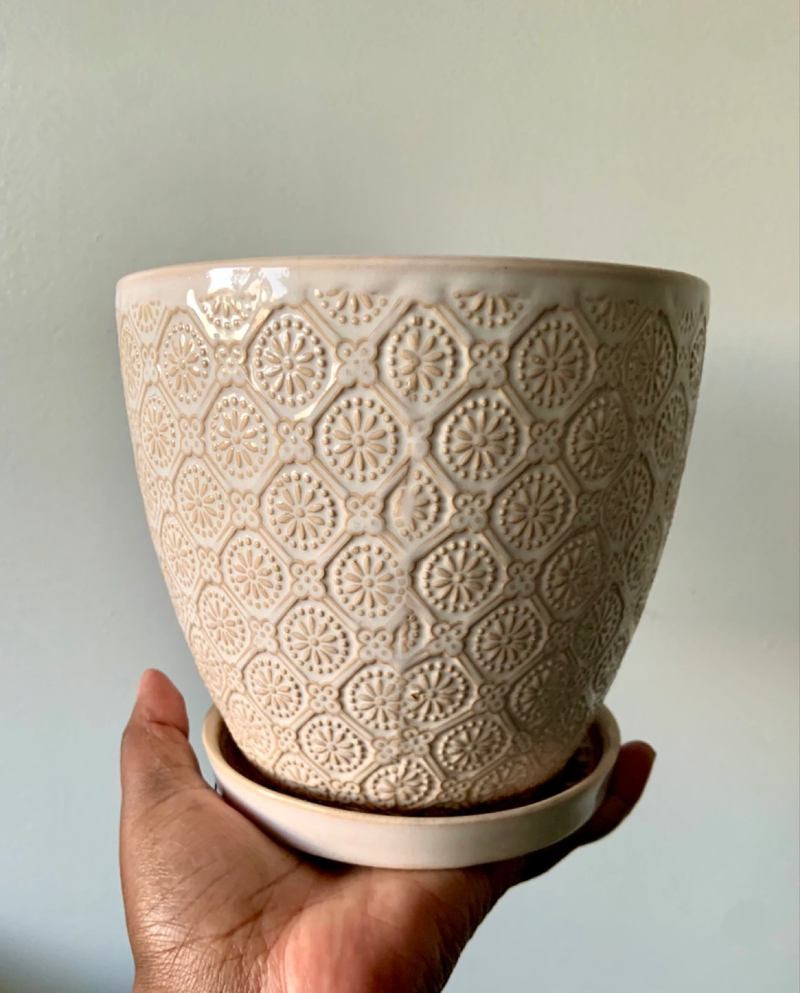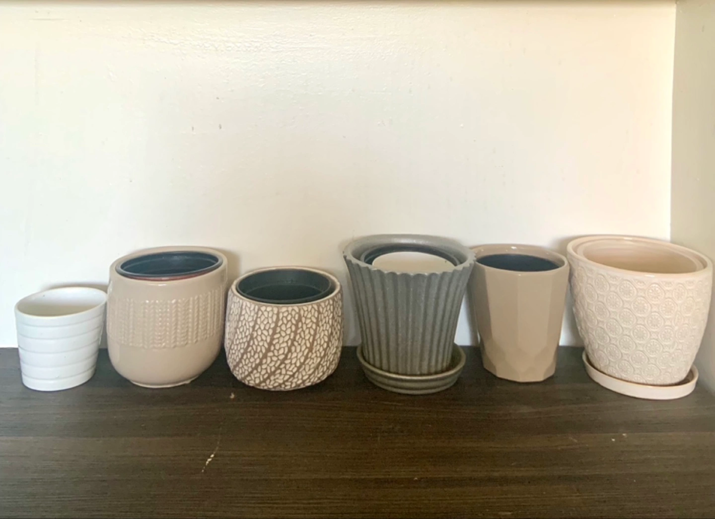 Six ceramic planters. Various colours and patterns. Includes saucers for some. Perfect for indoor plants.