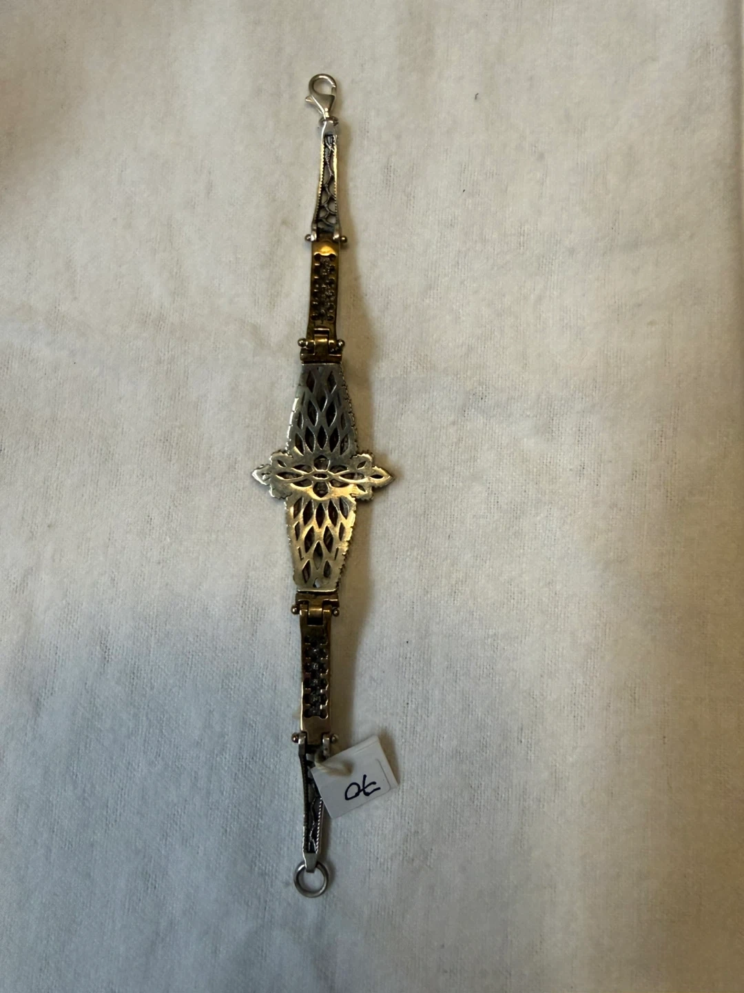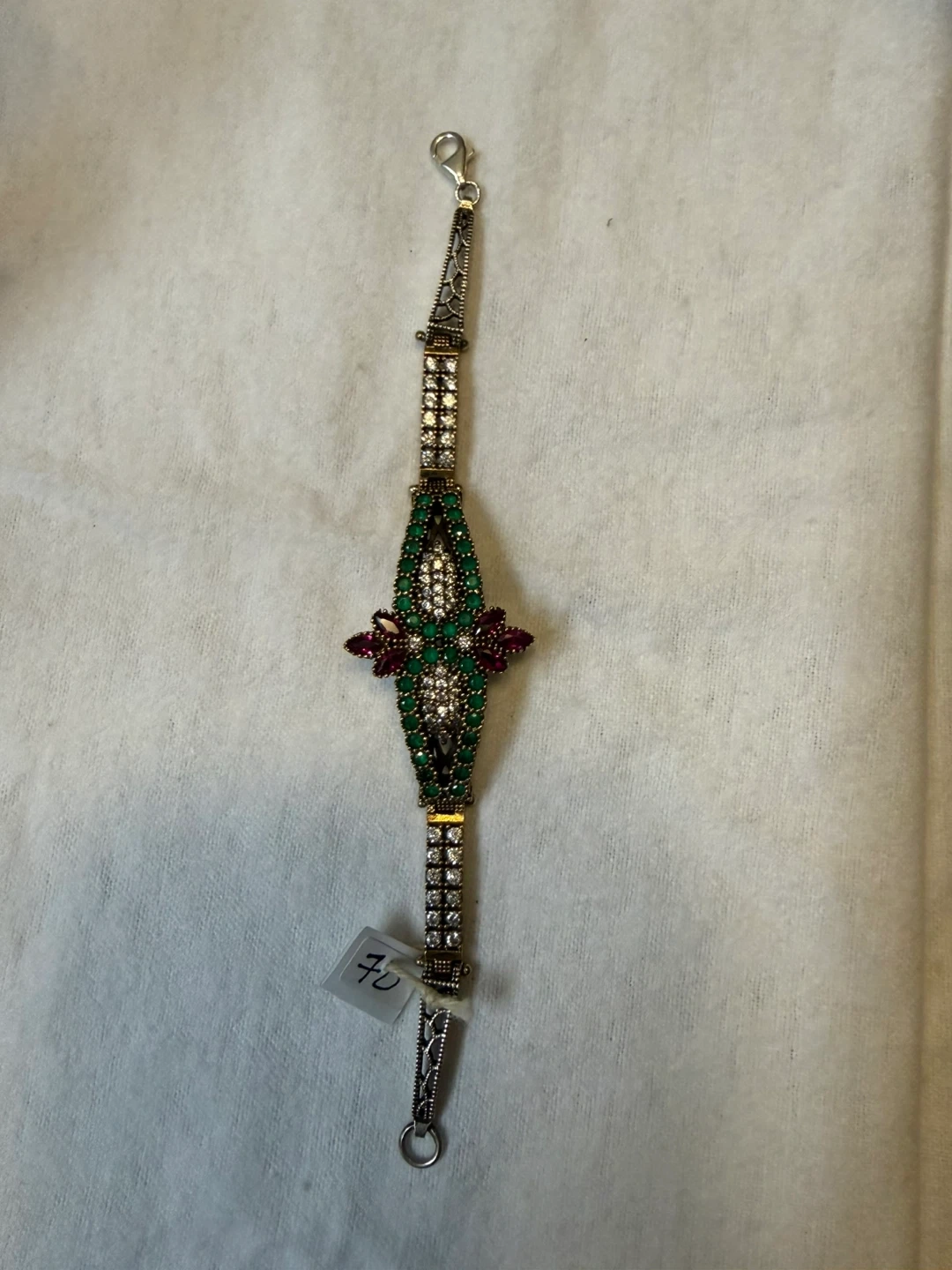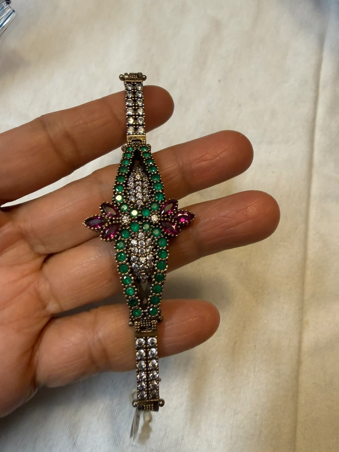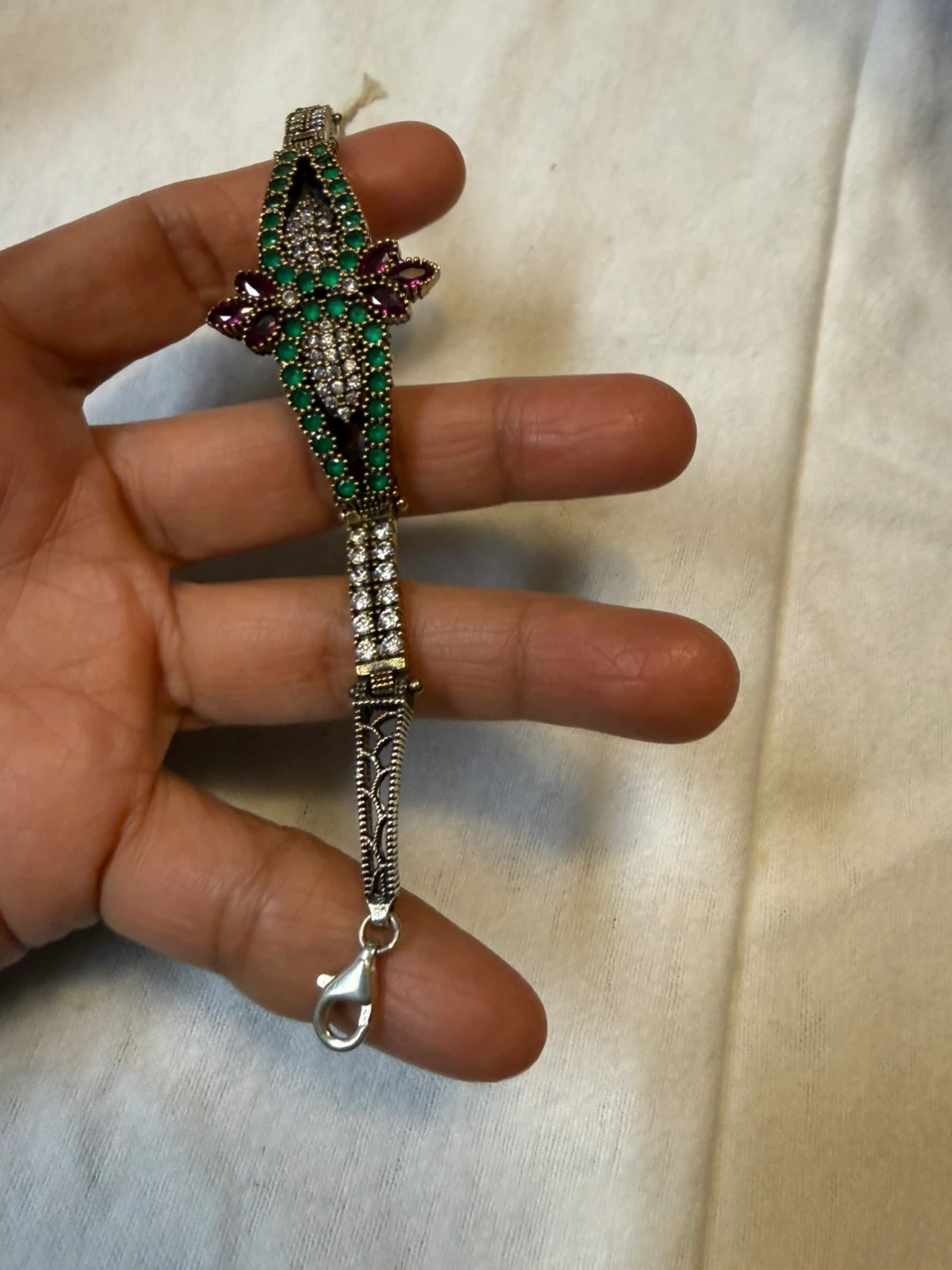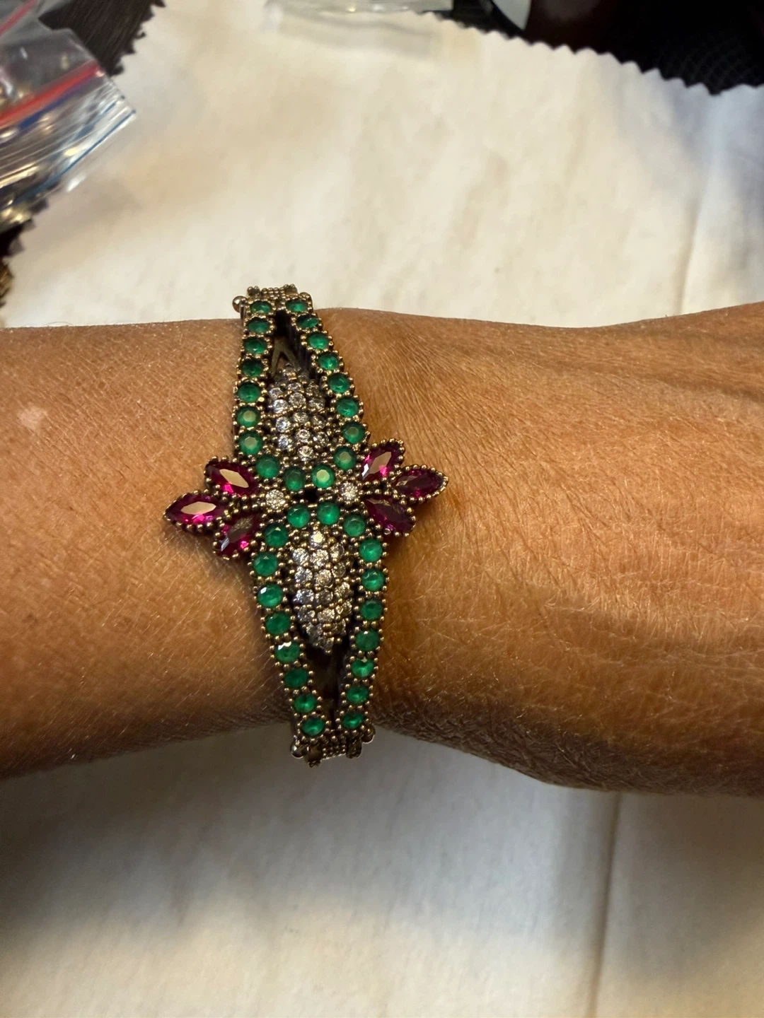 Beautiful ornate 6.5” bracelet featuring green and red stones with clear accents. It's sterling silver and copper with intricate detailing. This piece adds a touch of elegance to any outfit!