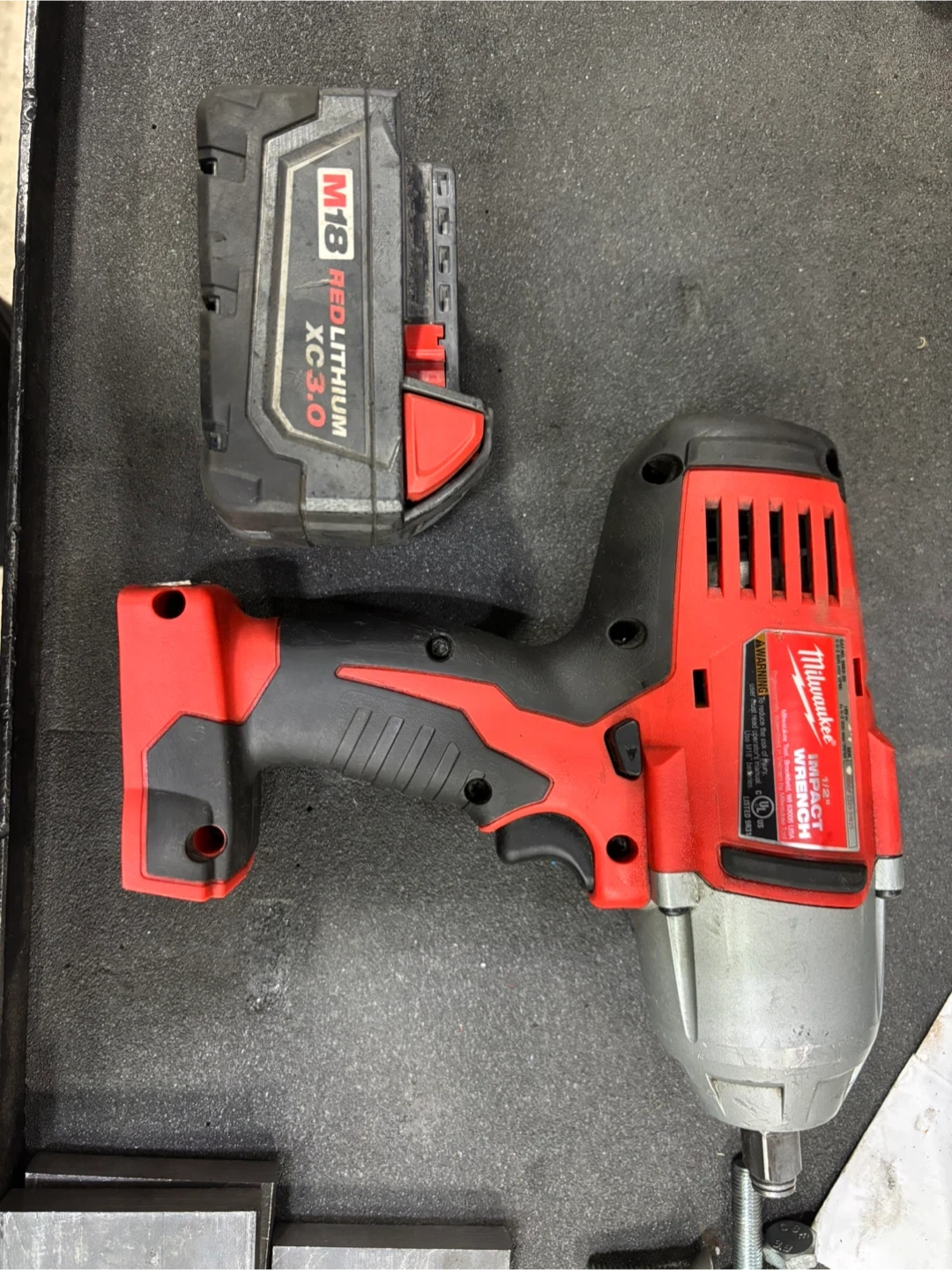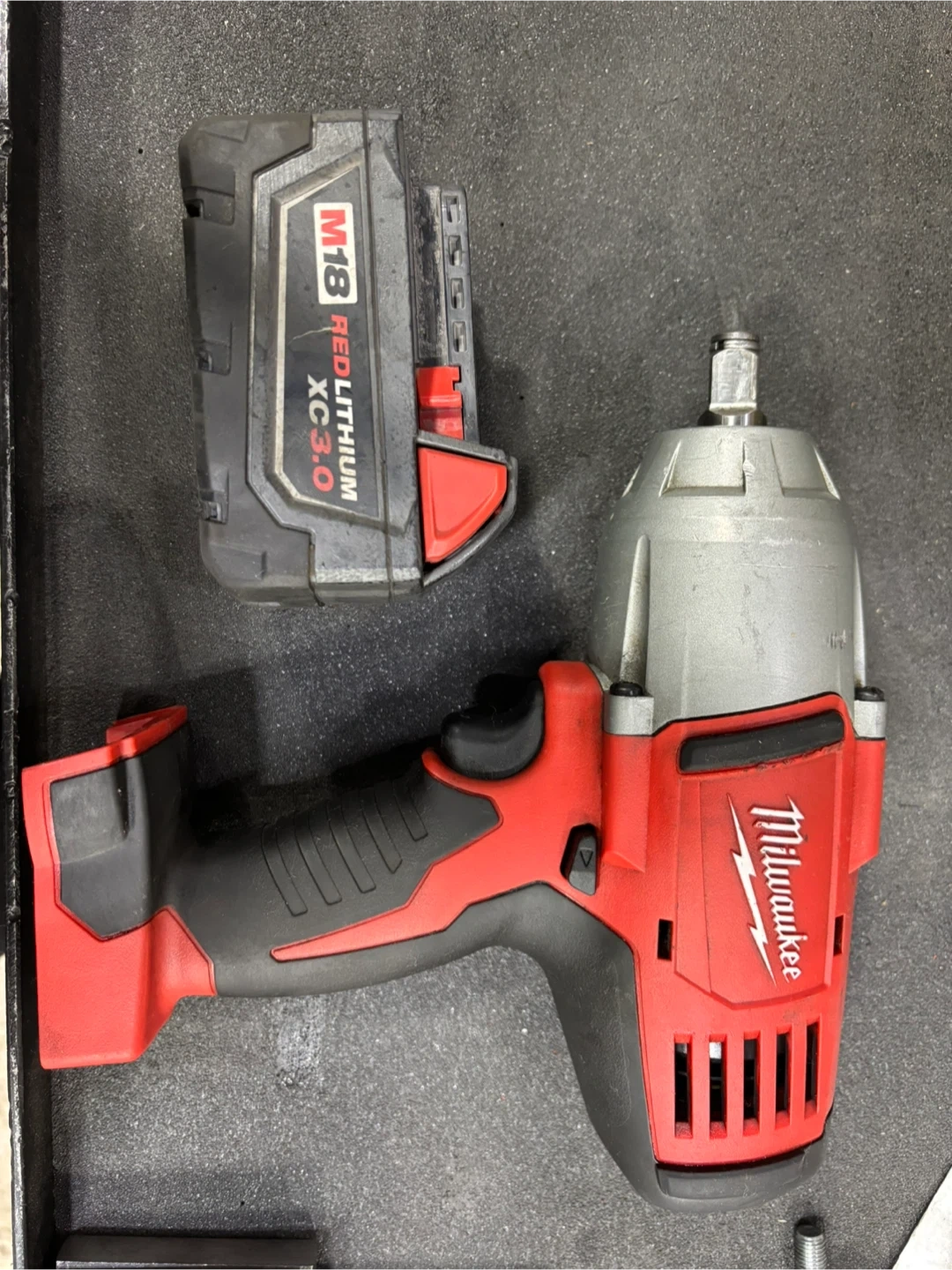 Milwaukee M18 1/2 inch cordless impact wrench with a Red Lithium XC 3.0 battery included. It's a tool for automotive or mechanical tasks.